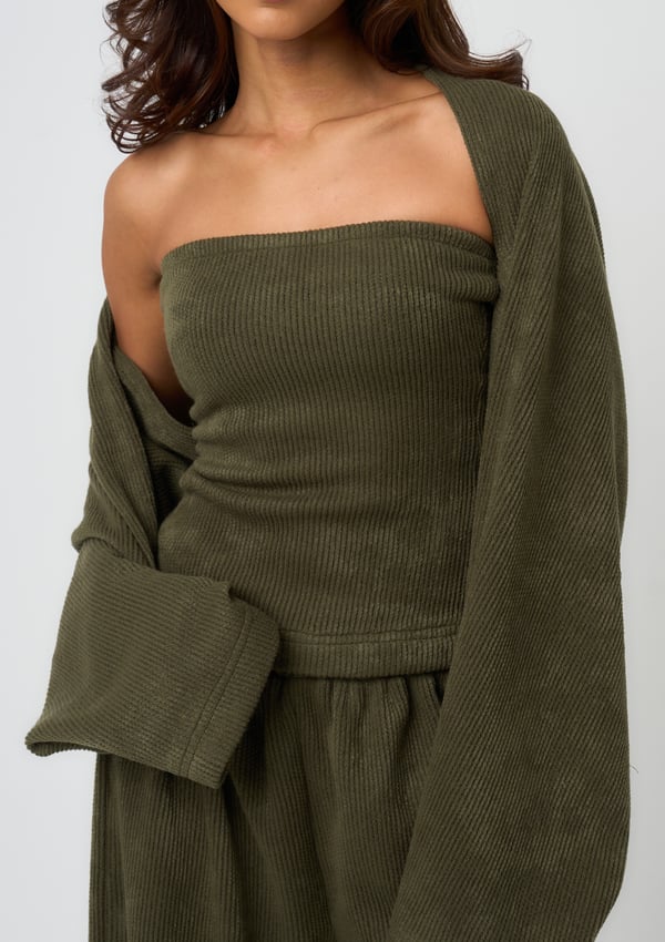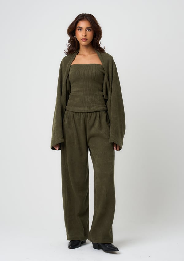 3 piece set: Shrug, strapless top, and straight leg pants.