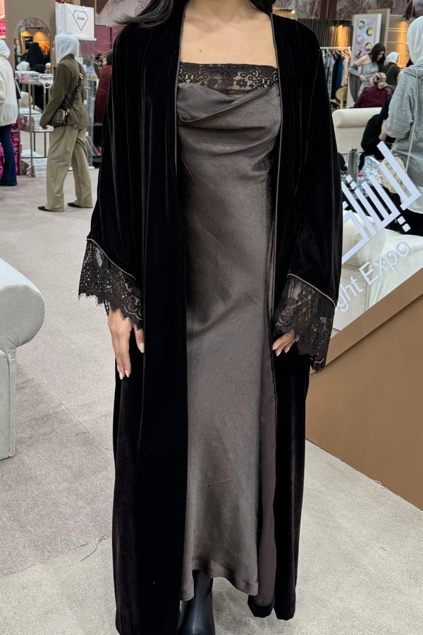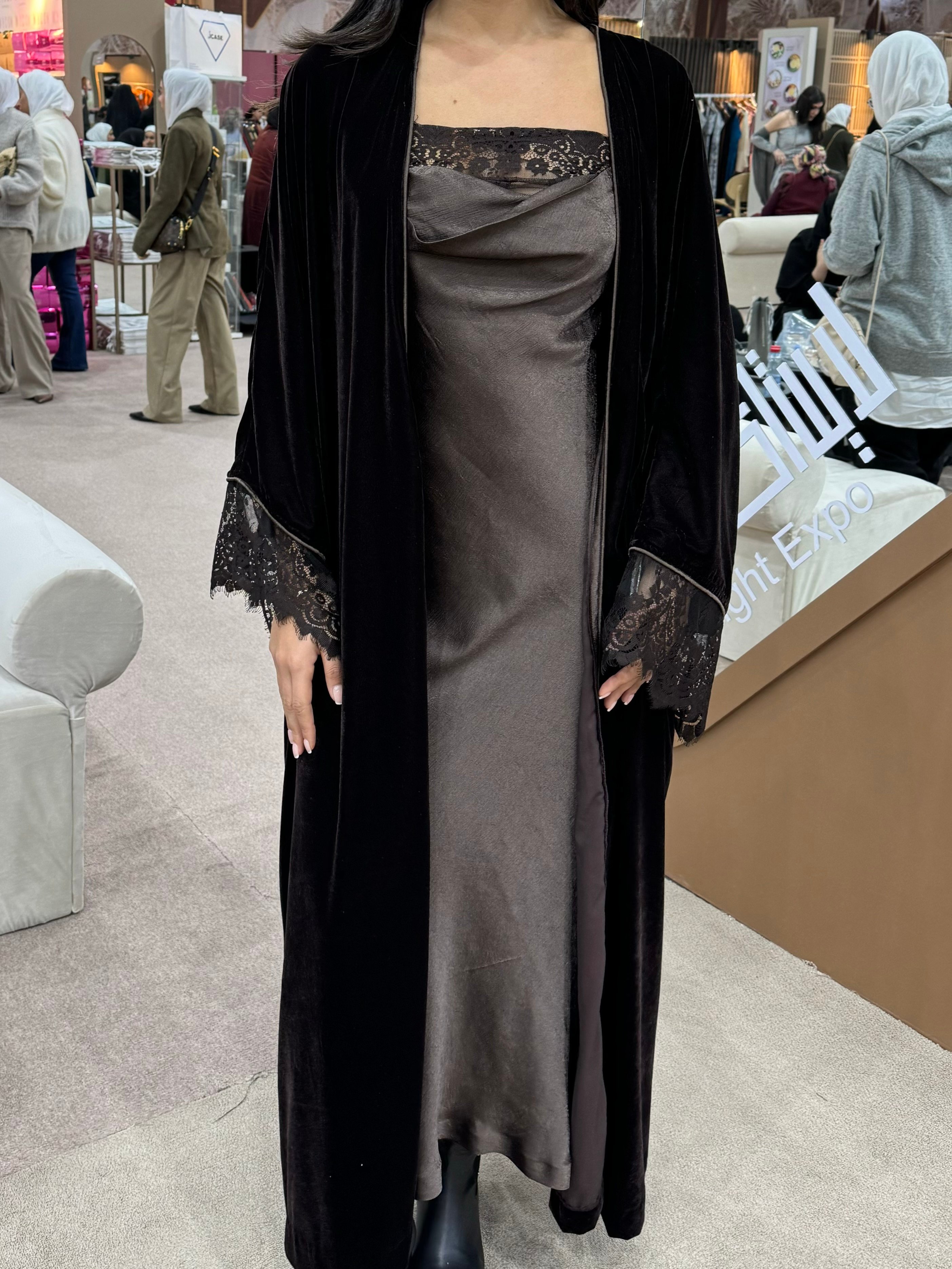 Two piece set: Velvet bisht that has silk trim and lace on the sleeves with a matching slip underdress that has a lace draped neckline.