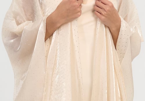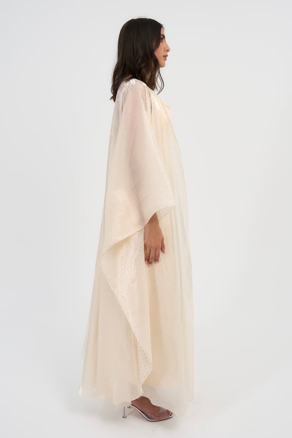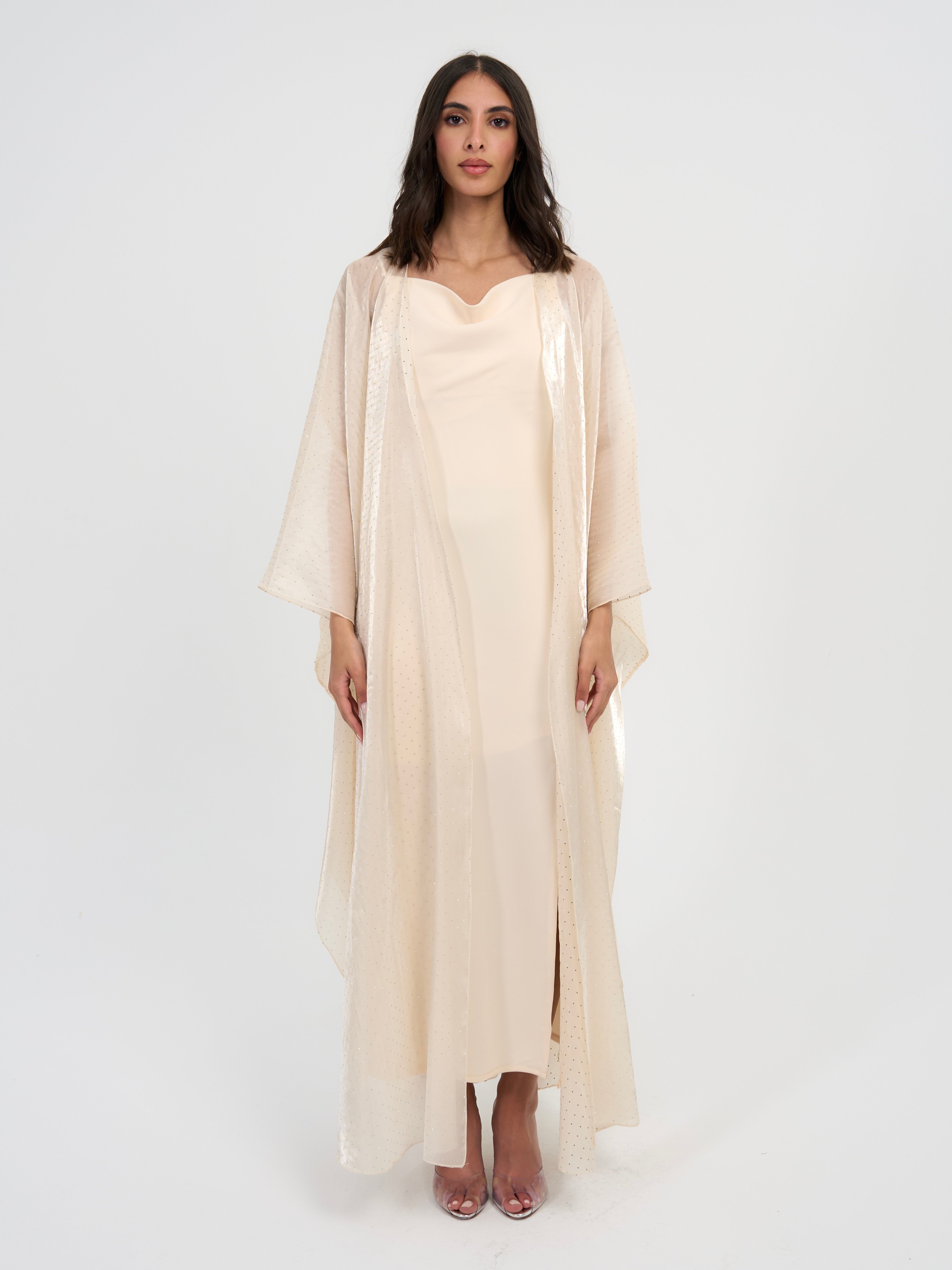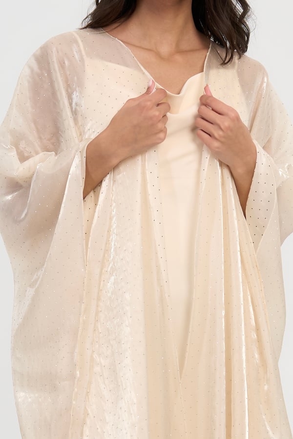 Three piece set: Organza studded bisht with a slip dress and it also comes with a matching scarf / sheila.