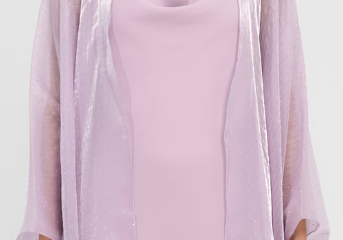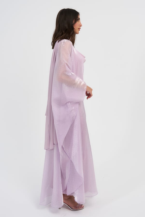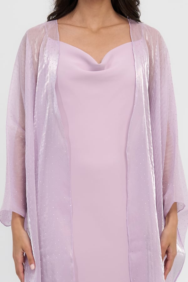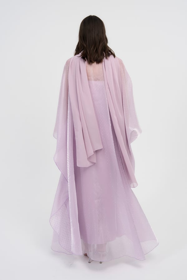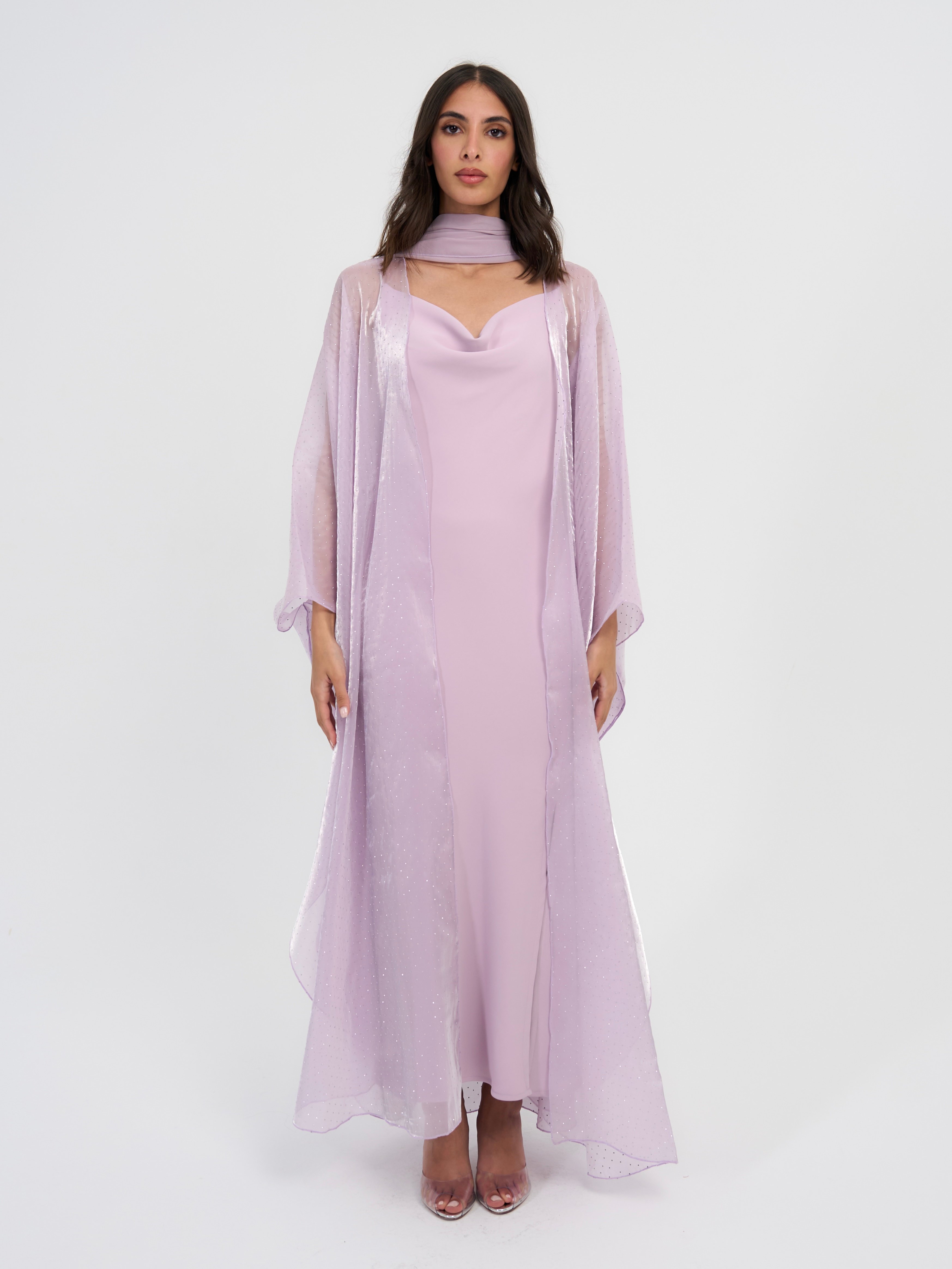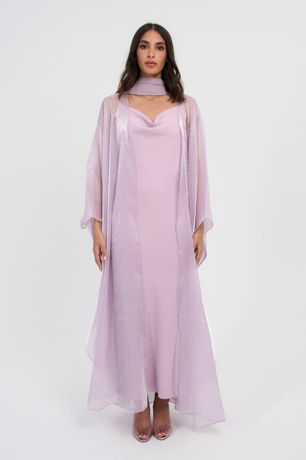 Three piece set: Organza studded bisht with a slip dress and it also comes with a matching scarf / sheila.