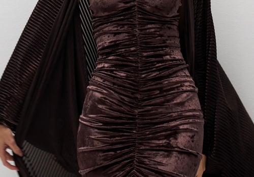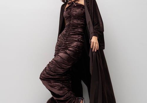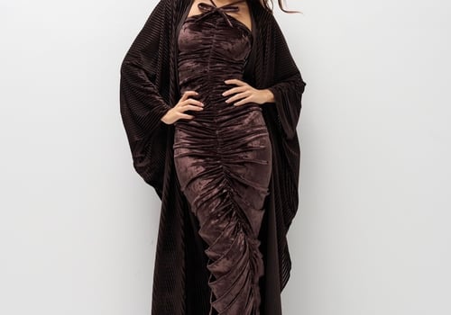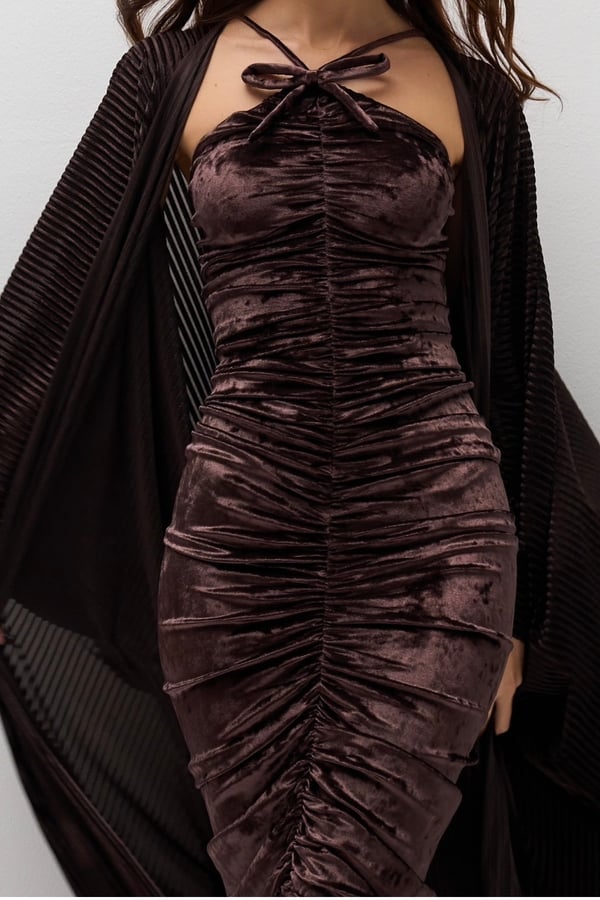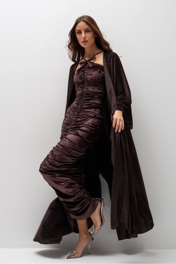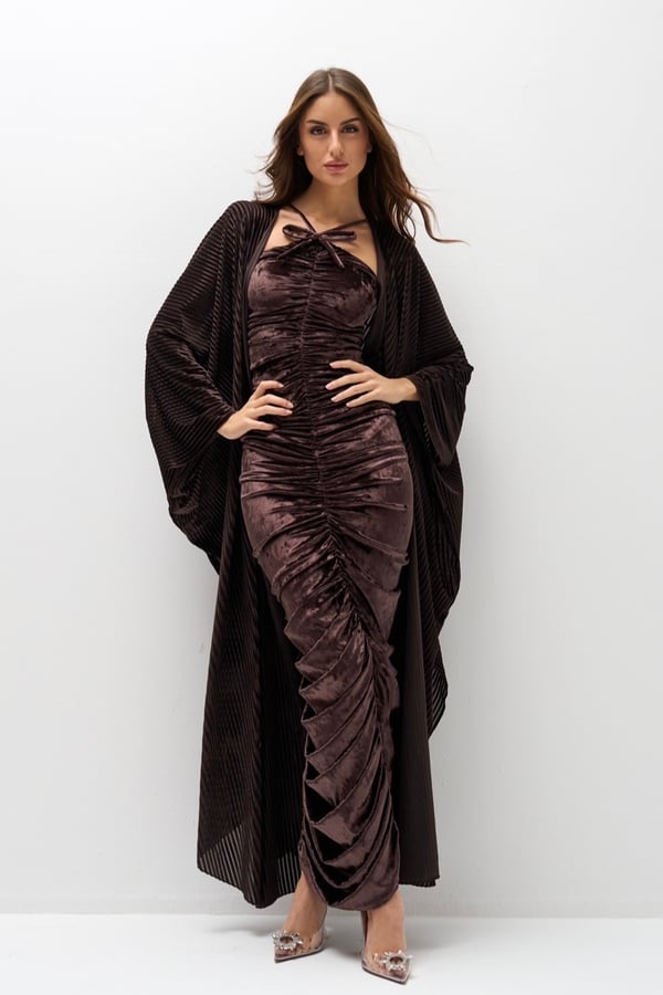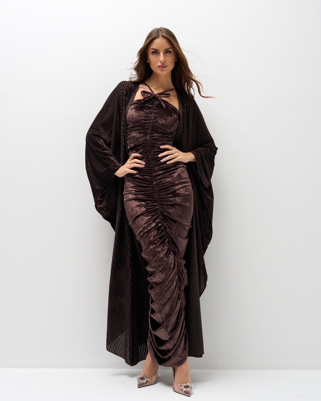 The set features a stretchy ruched velvet dress with a cute bow on the neckline layered with a striped velvet bisht.