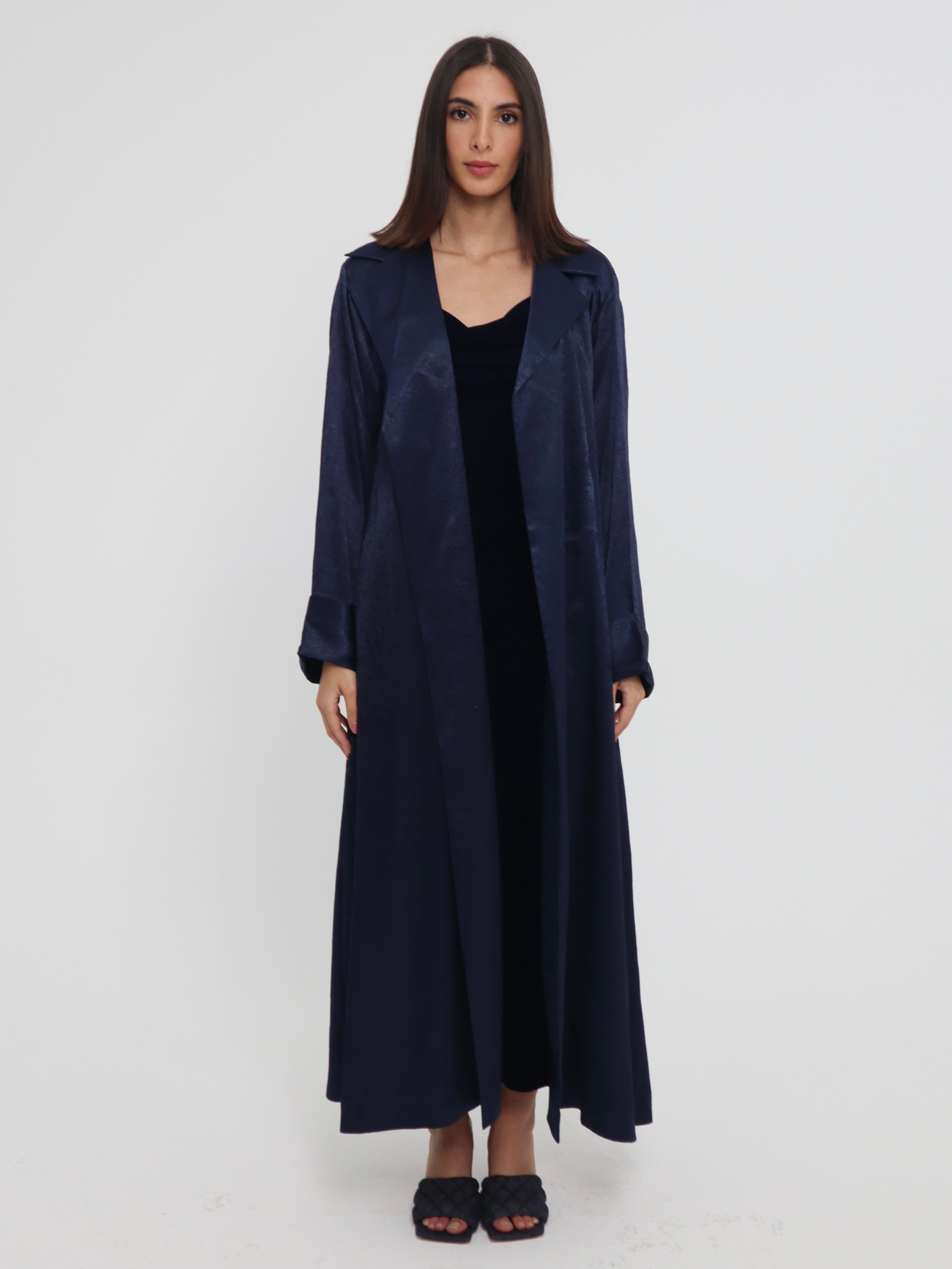 Two piece set: Silk trench coat with a velvet dress that has a draped neckline, a side slit, and adjustable straps that tie in the back.