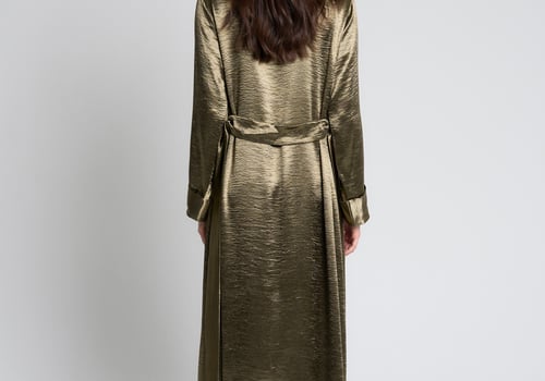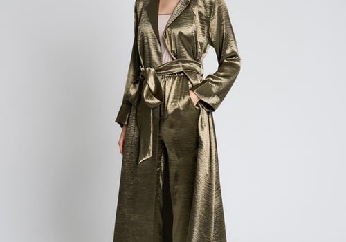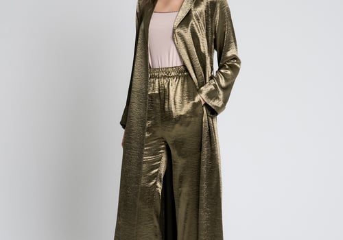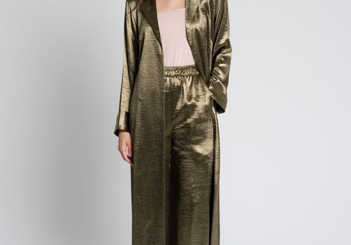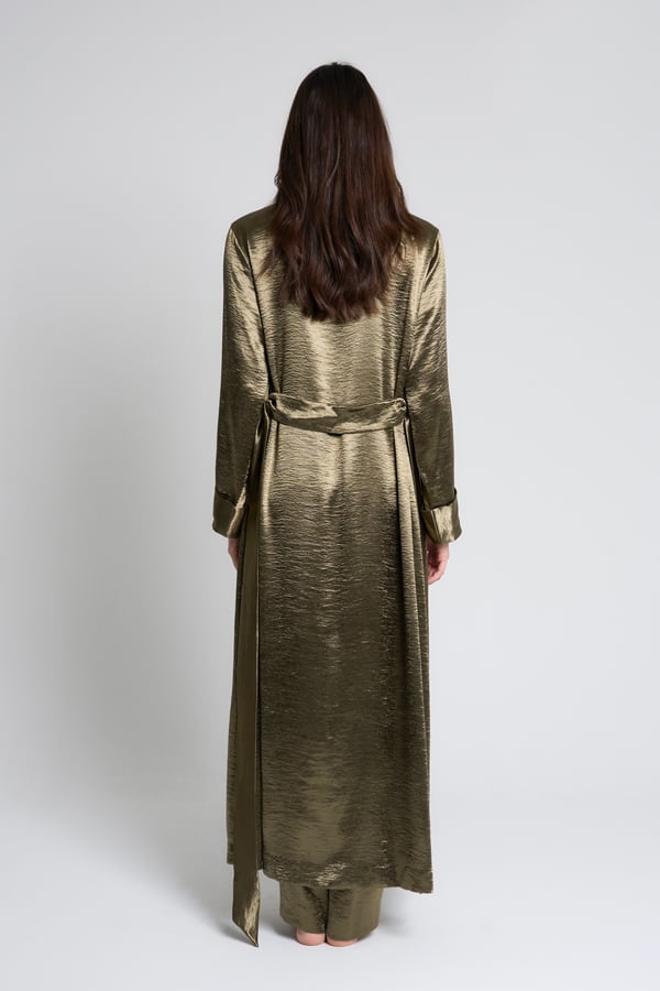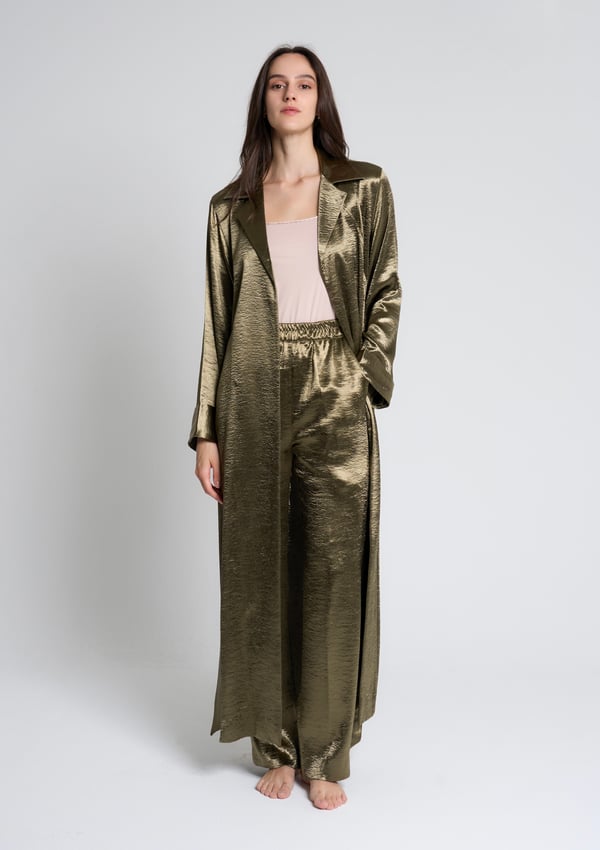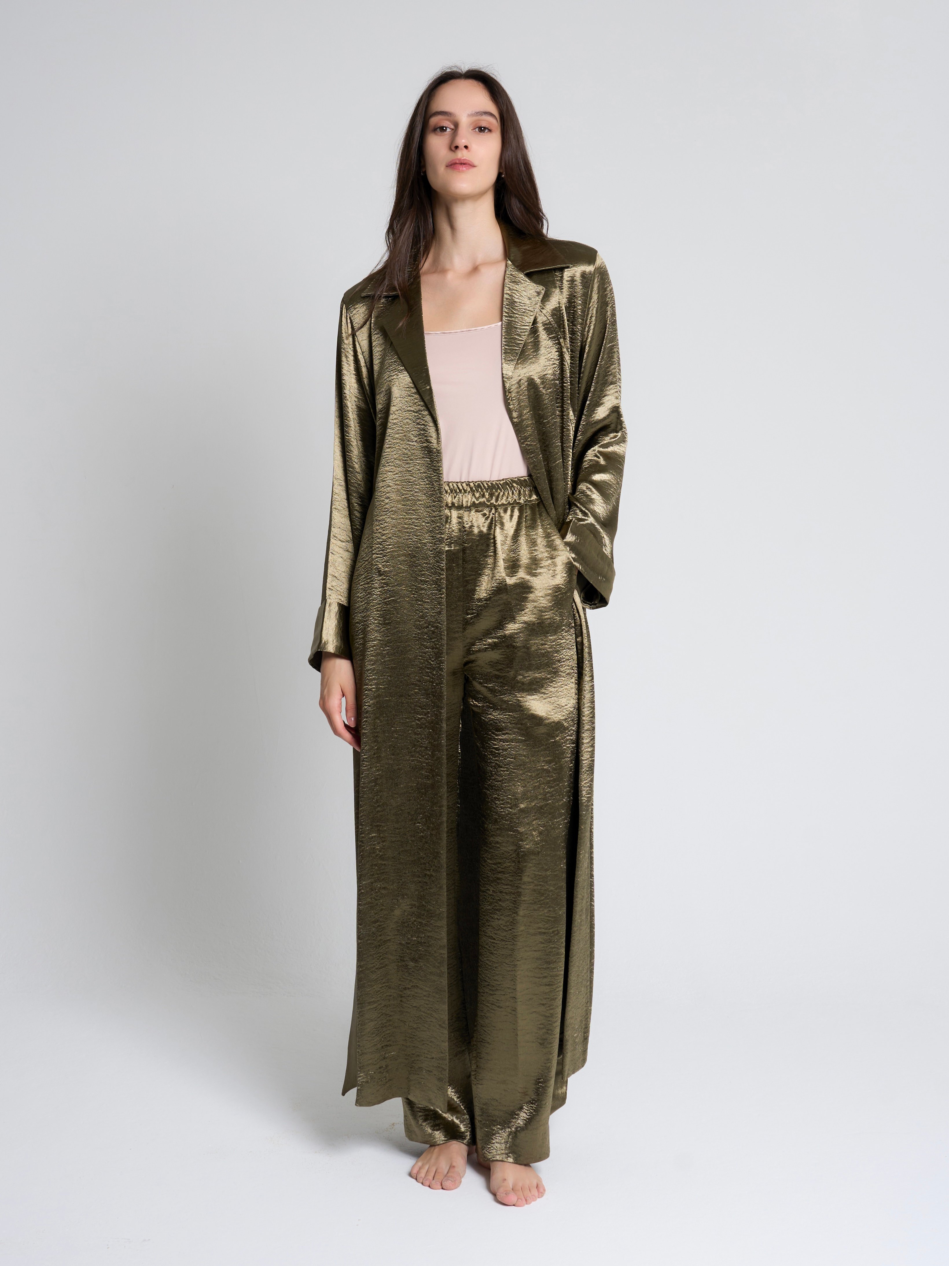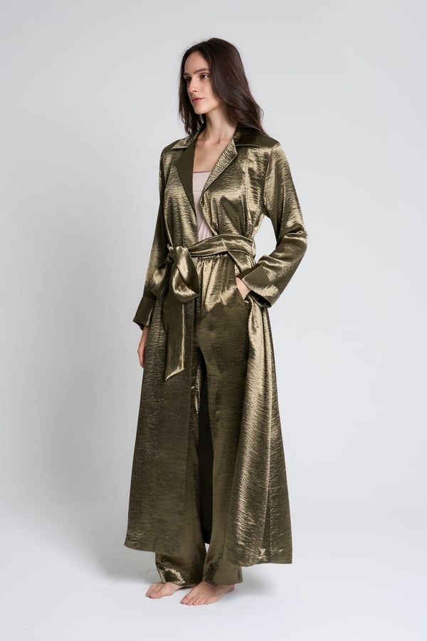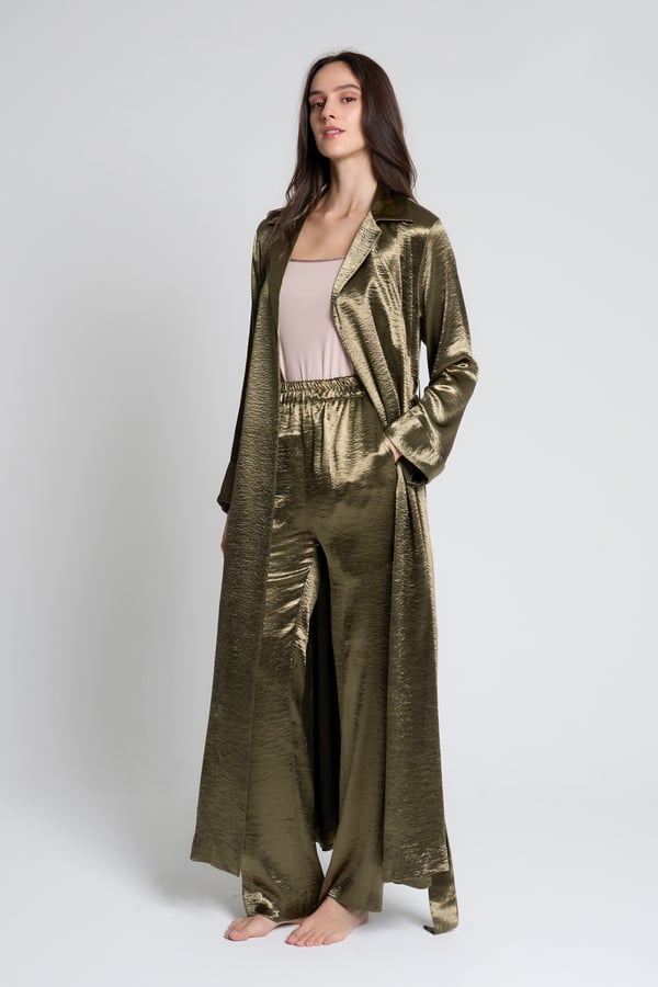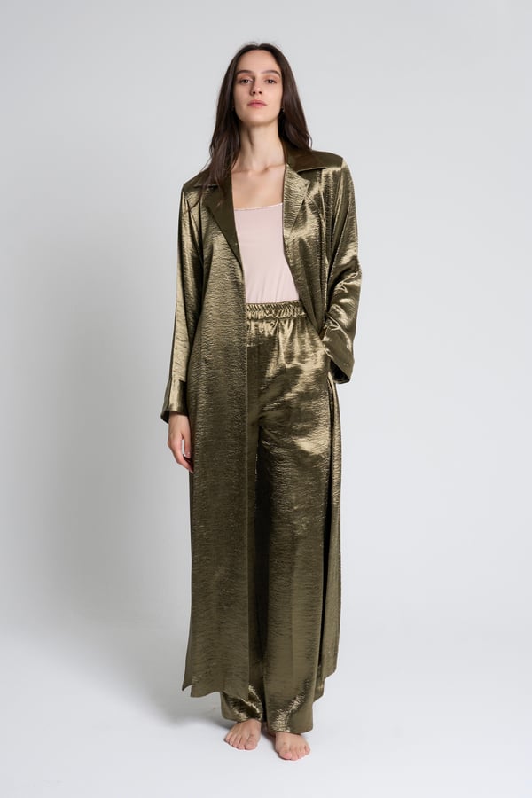 Two piece set: Silk trench coat with an adjustable wrap belt and a matching elastic waist pants.