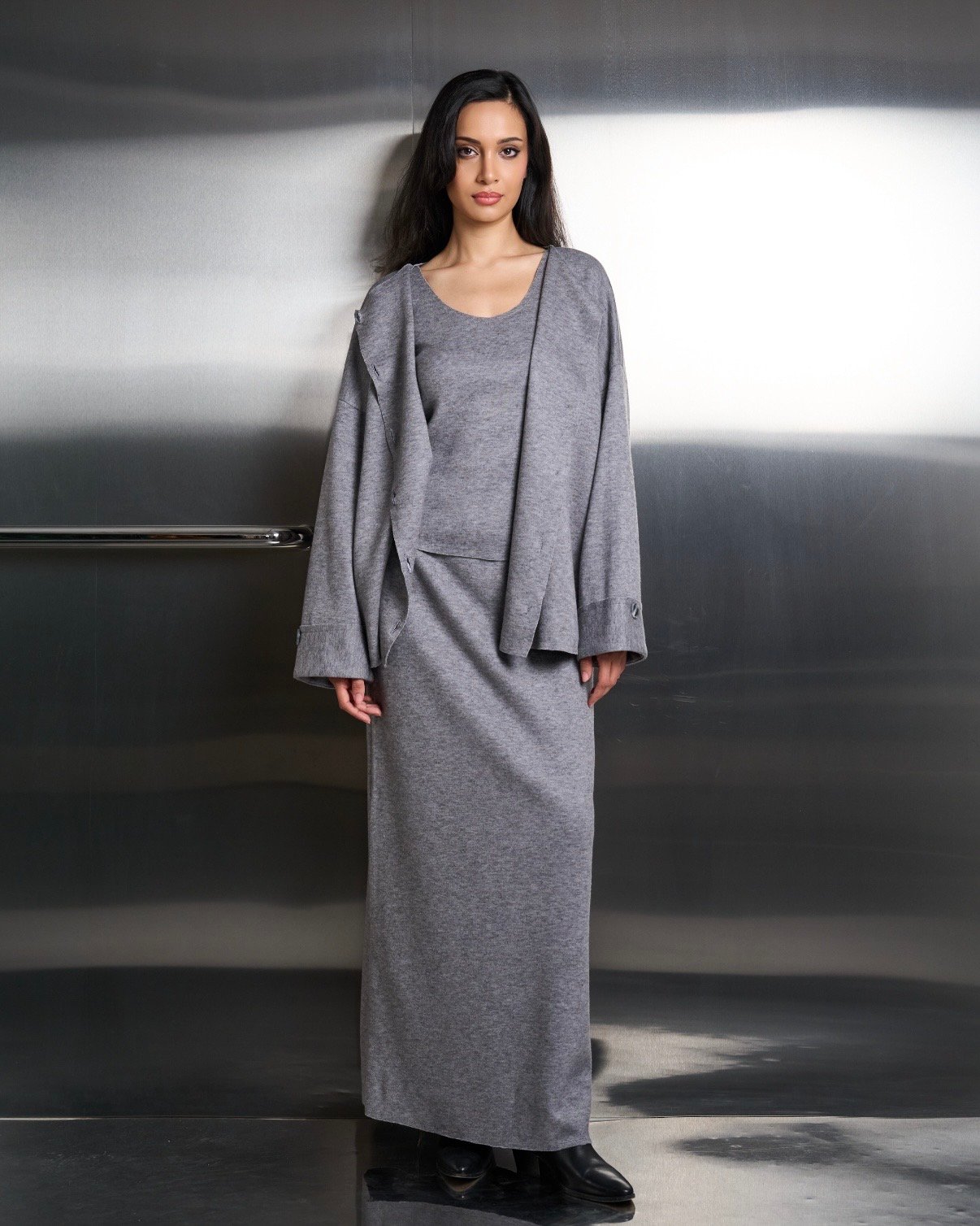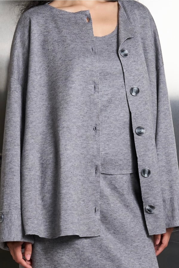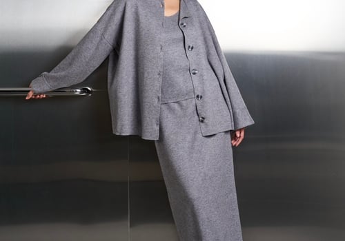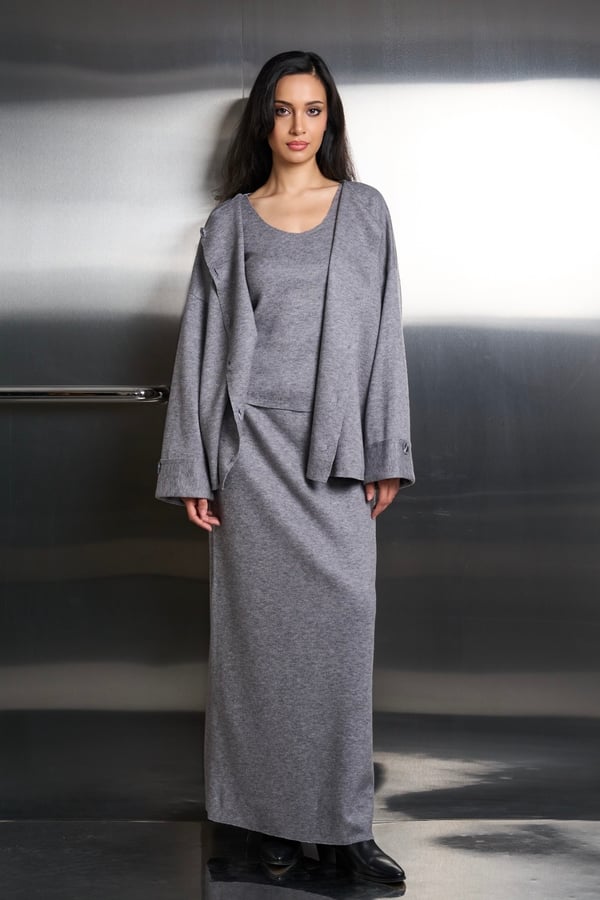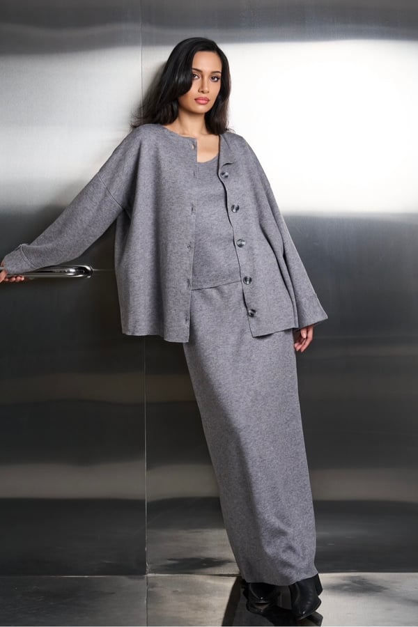 A comfy three piece set that features a cotton fleece cardigan, top, and skirt. The pieces allow you to mix and match for stylish options.