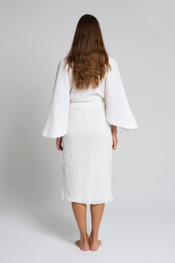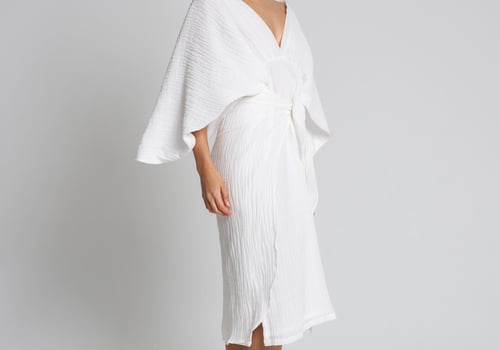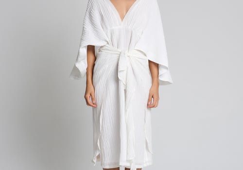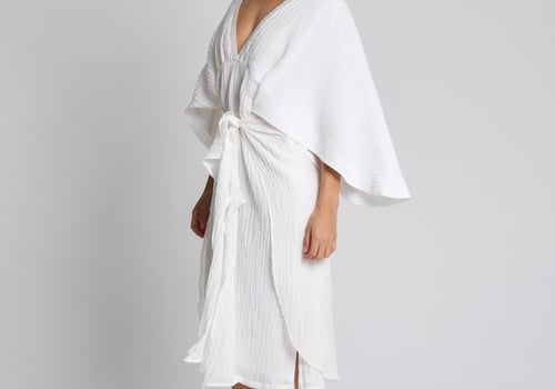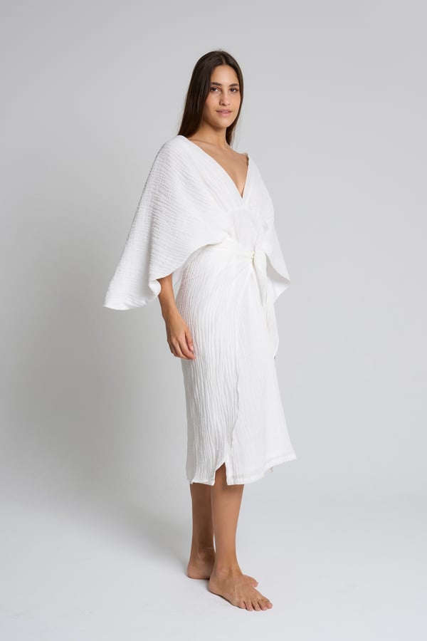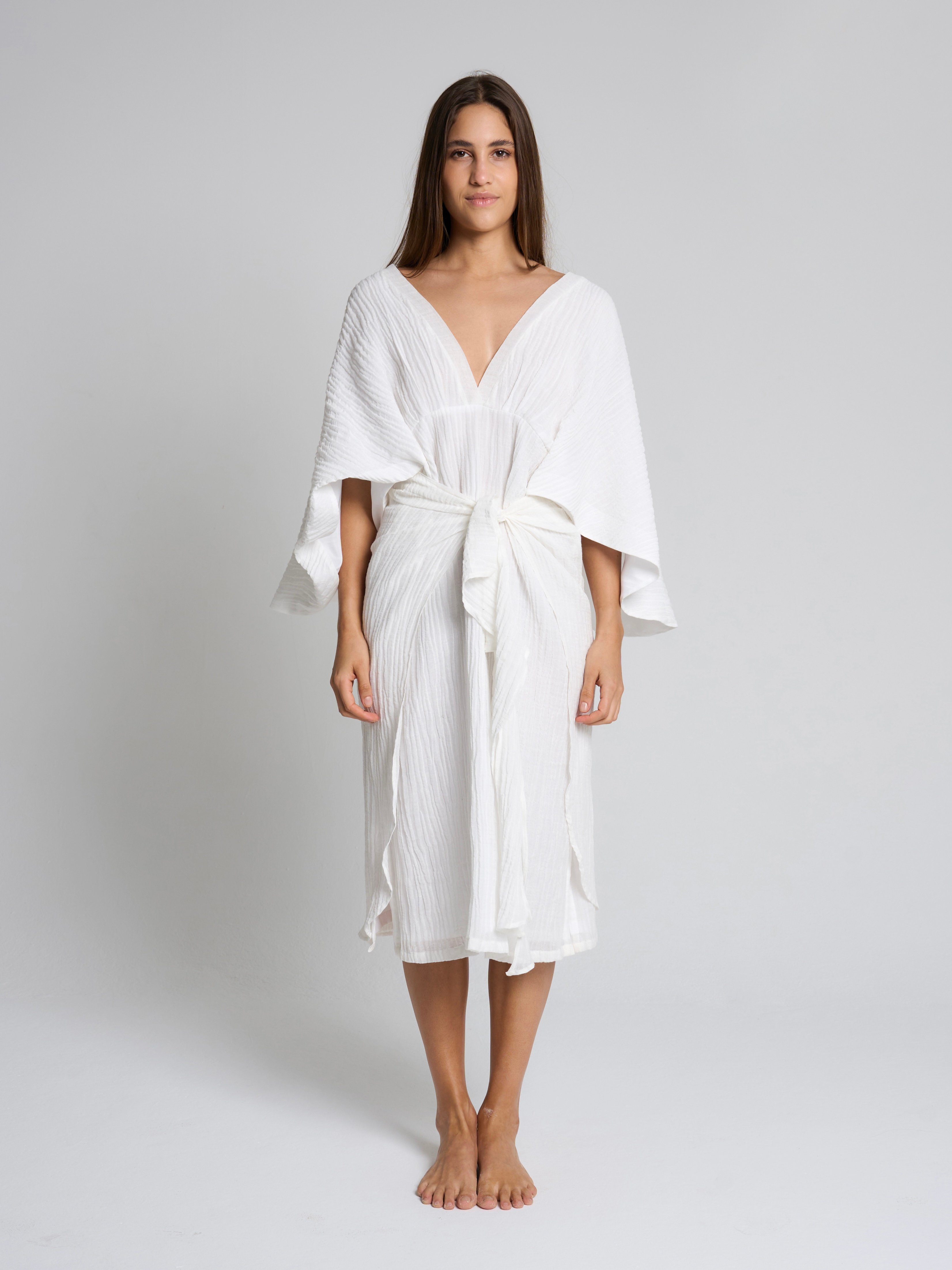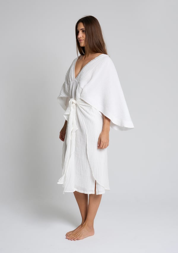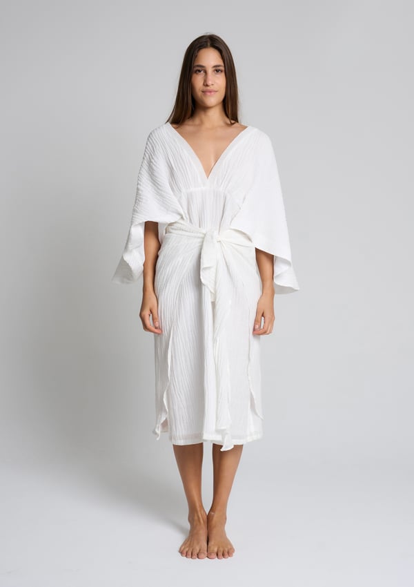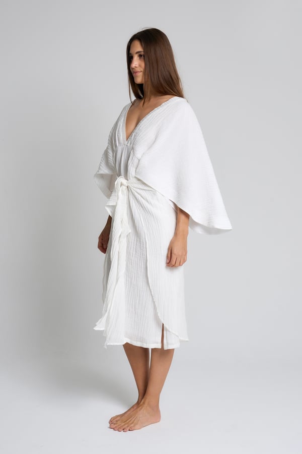 Style: Linen dress with flowy sleeves, comes with a front tie style.
