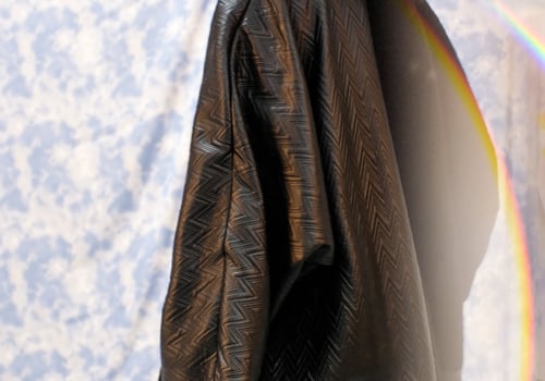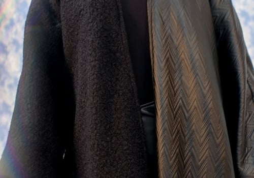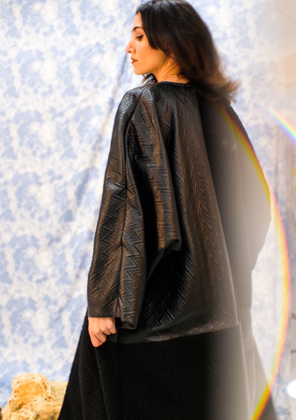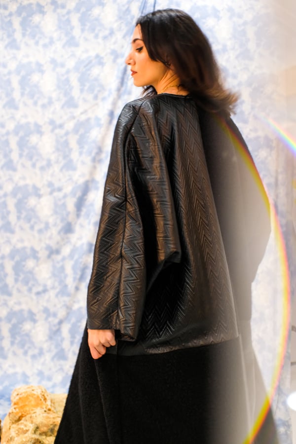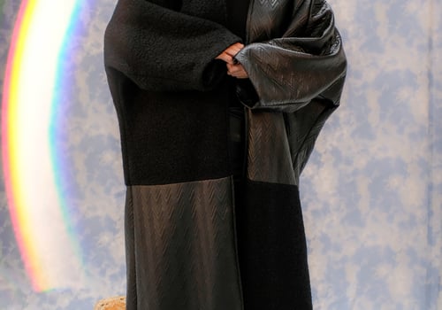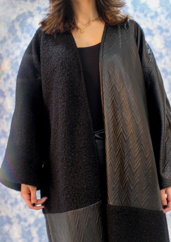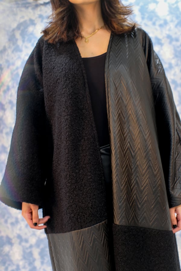 Winter bisht checkered in leather and shearling, both materials are black.