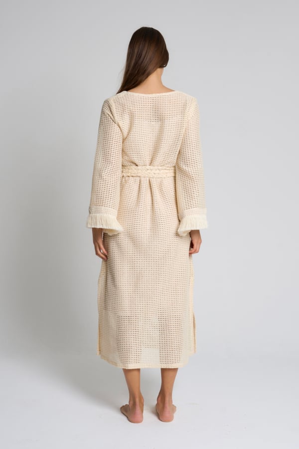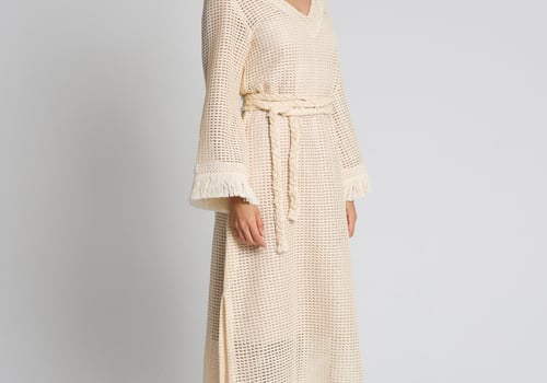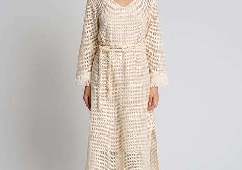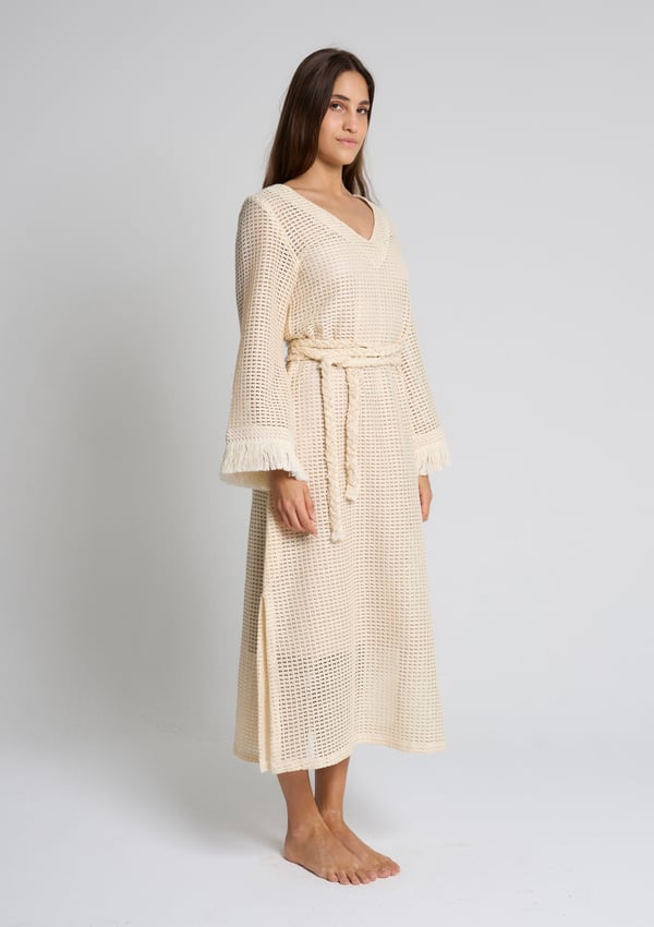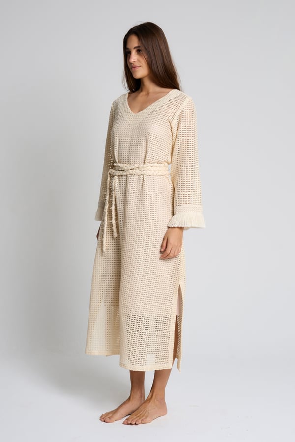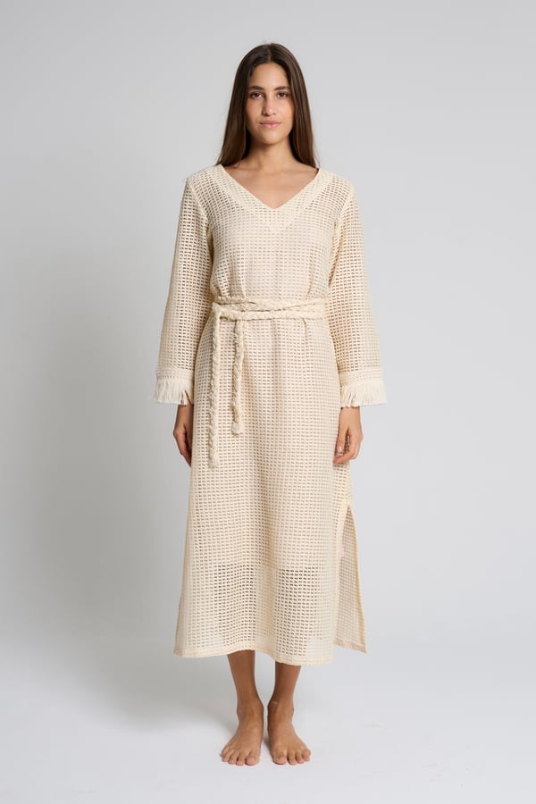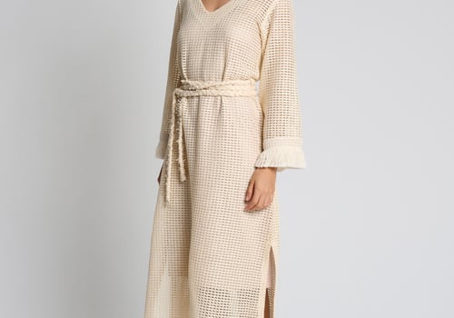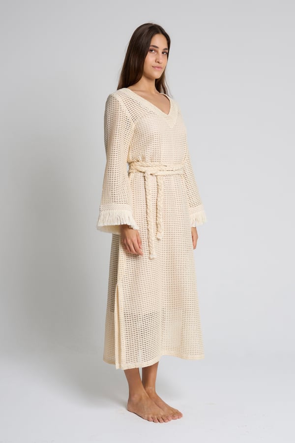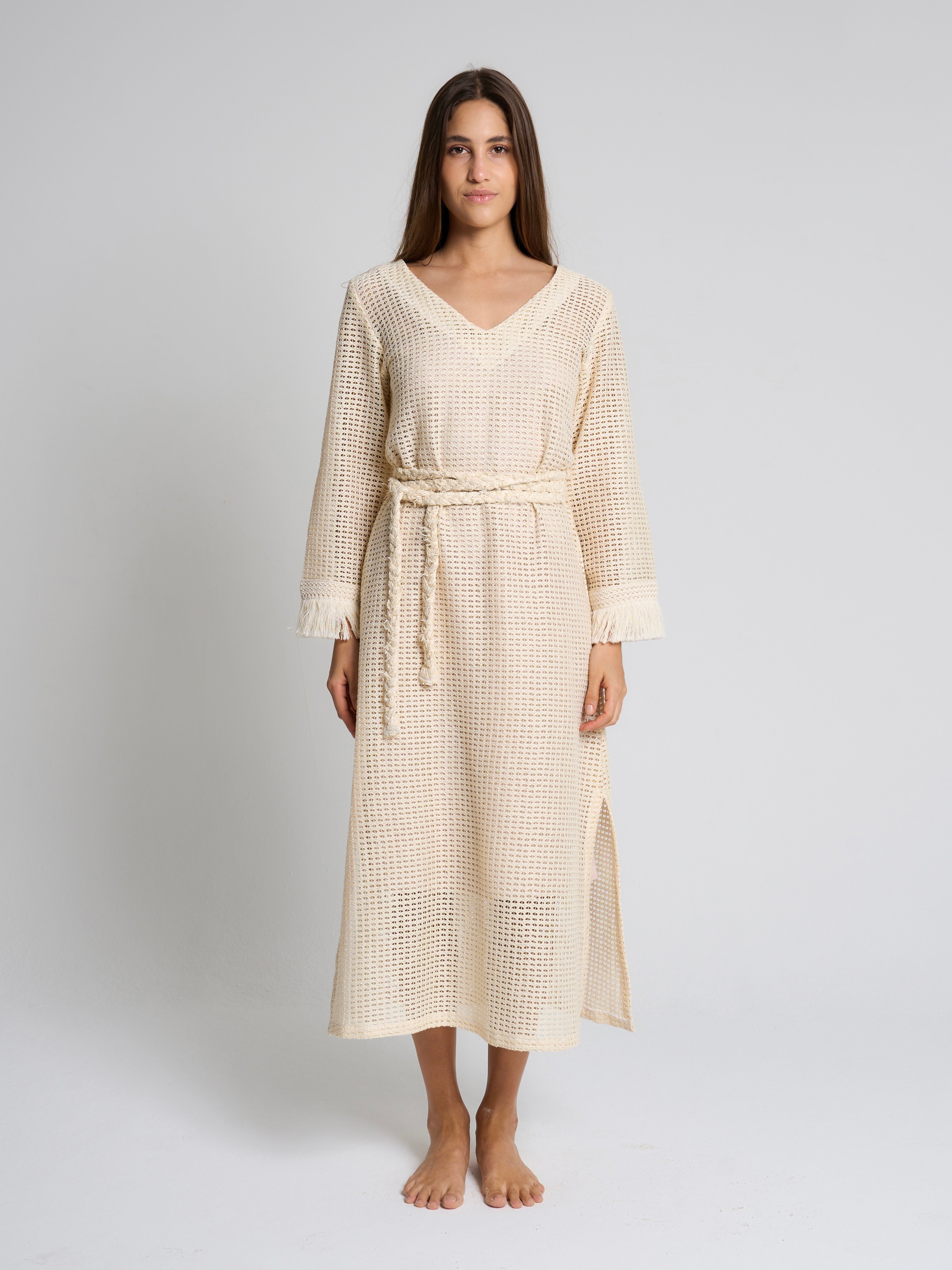 Style: Crochet beach dress with a braided belt, side slits and fringe detailing on the sleeves.