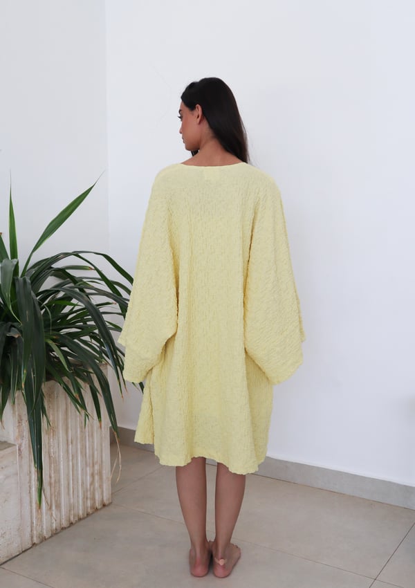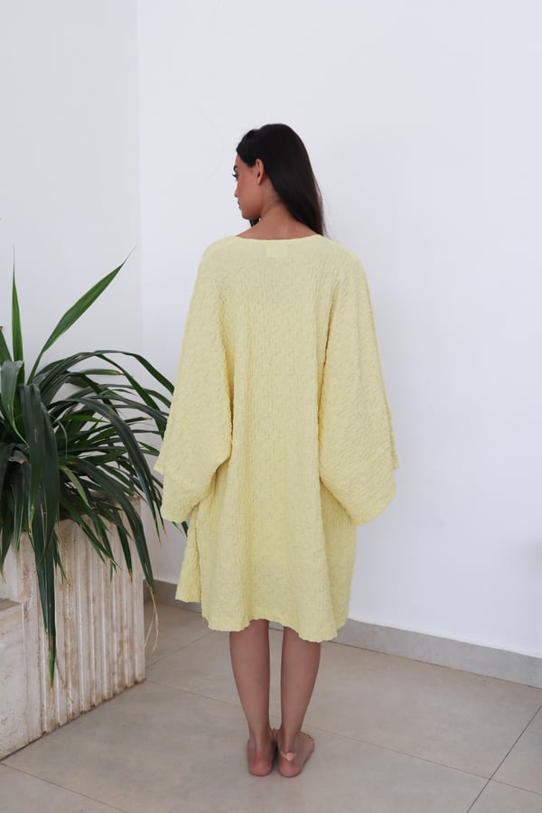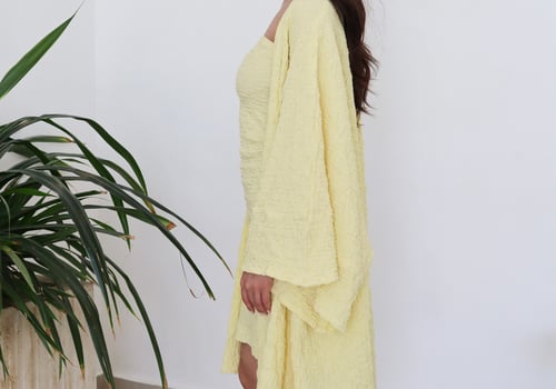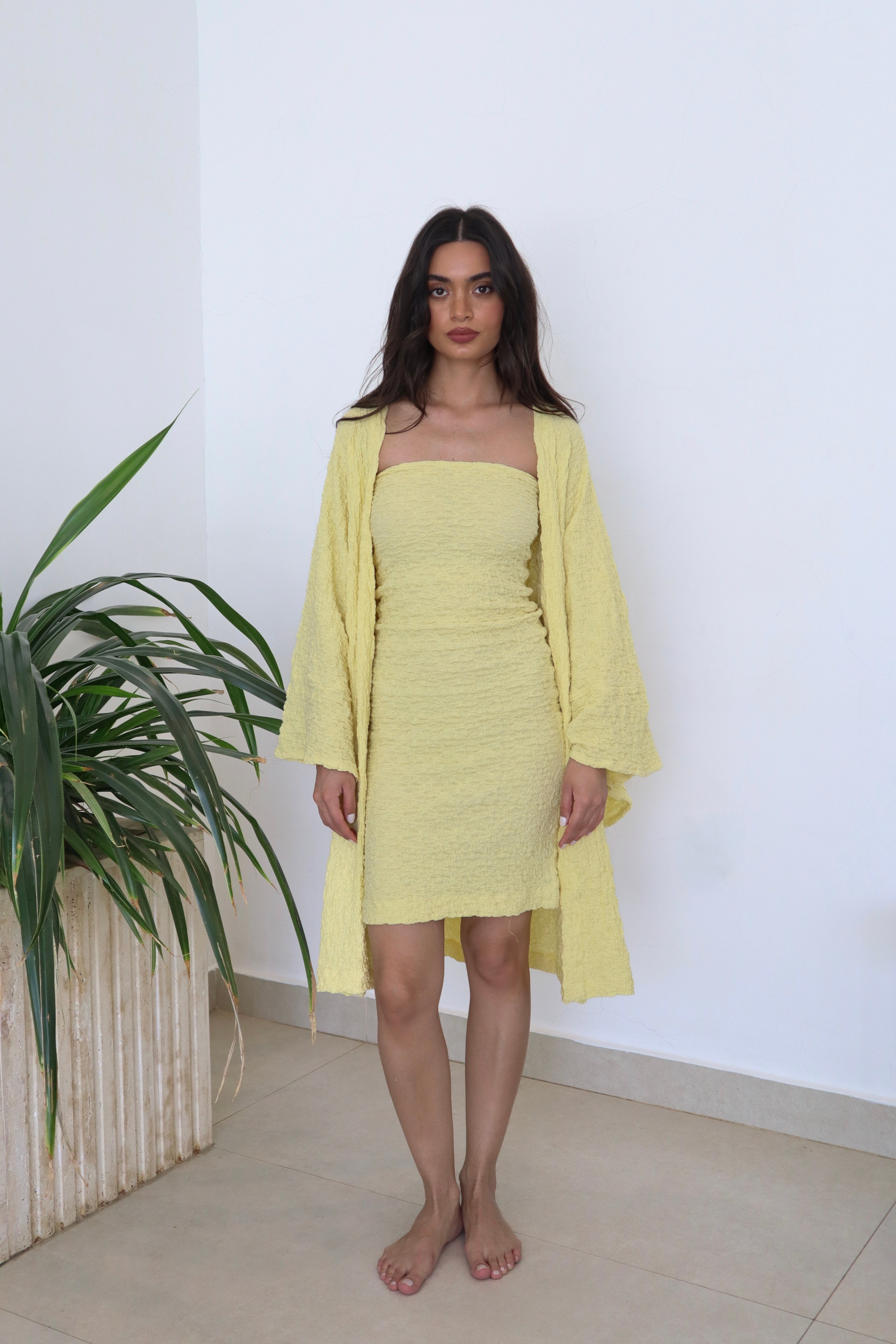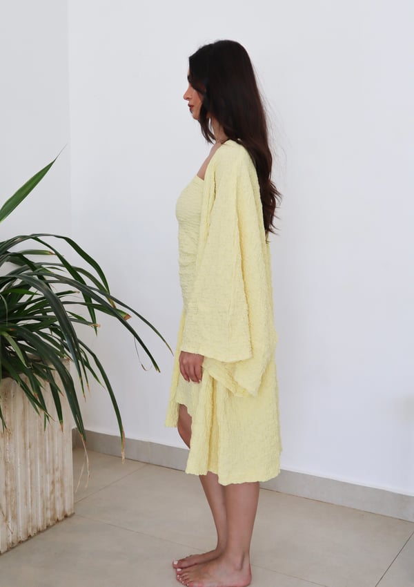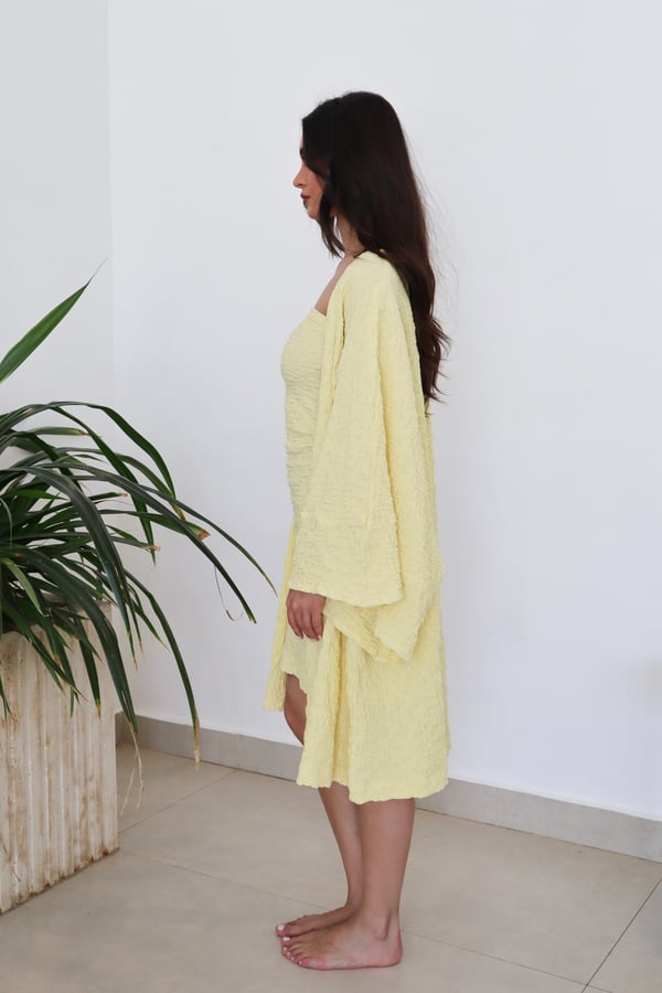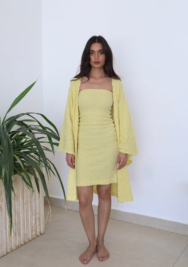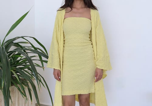 Two piece set: Cardigan with matching strapless underdress. Comes in both short and maxi length.