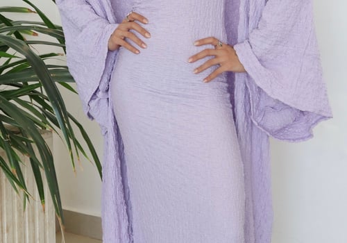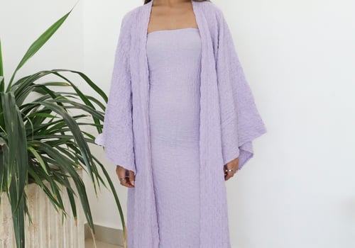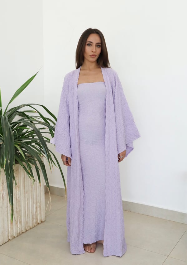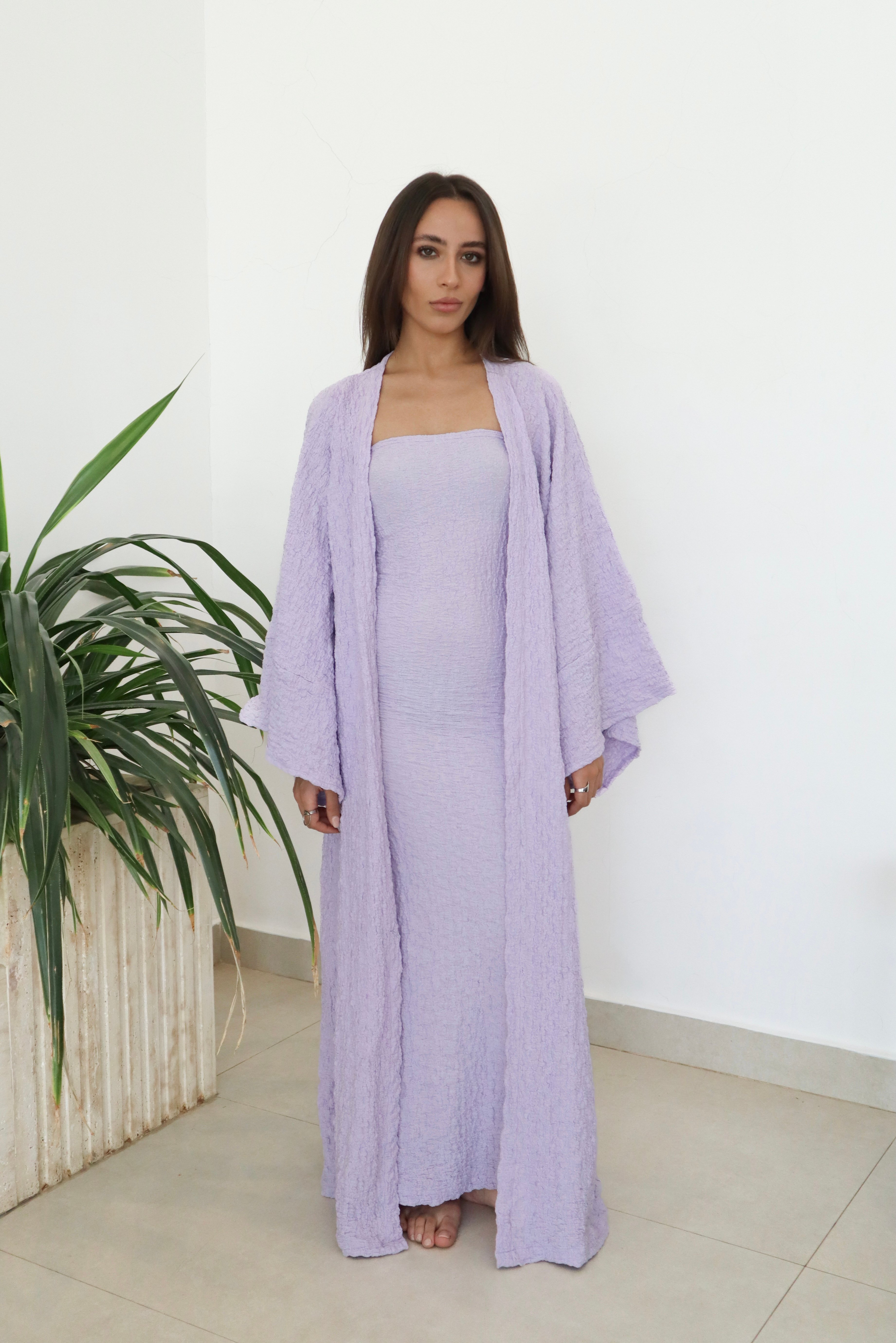 Two piece set: Cardigan with a matching strapless underdress. Comes in both short and maxi length.