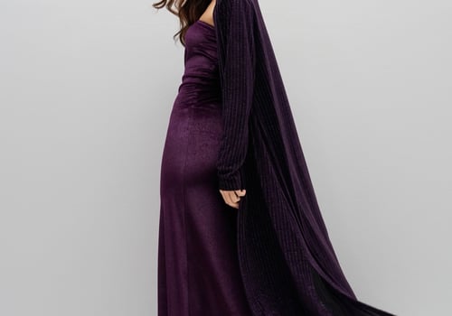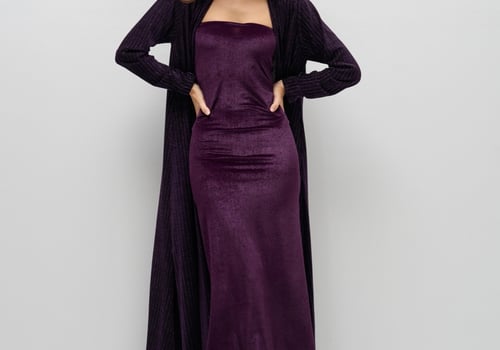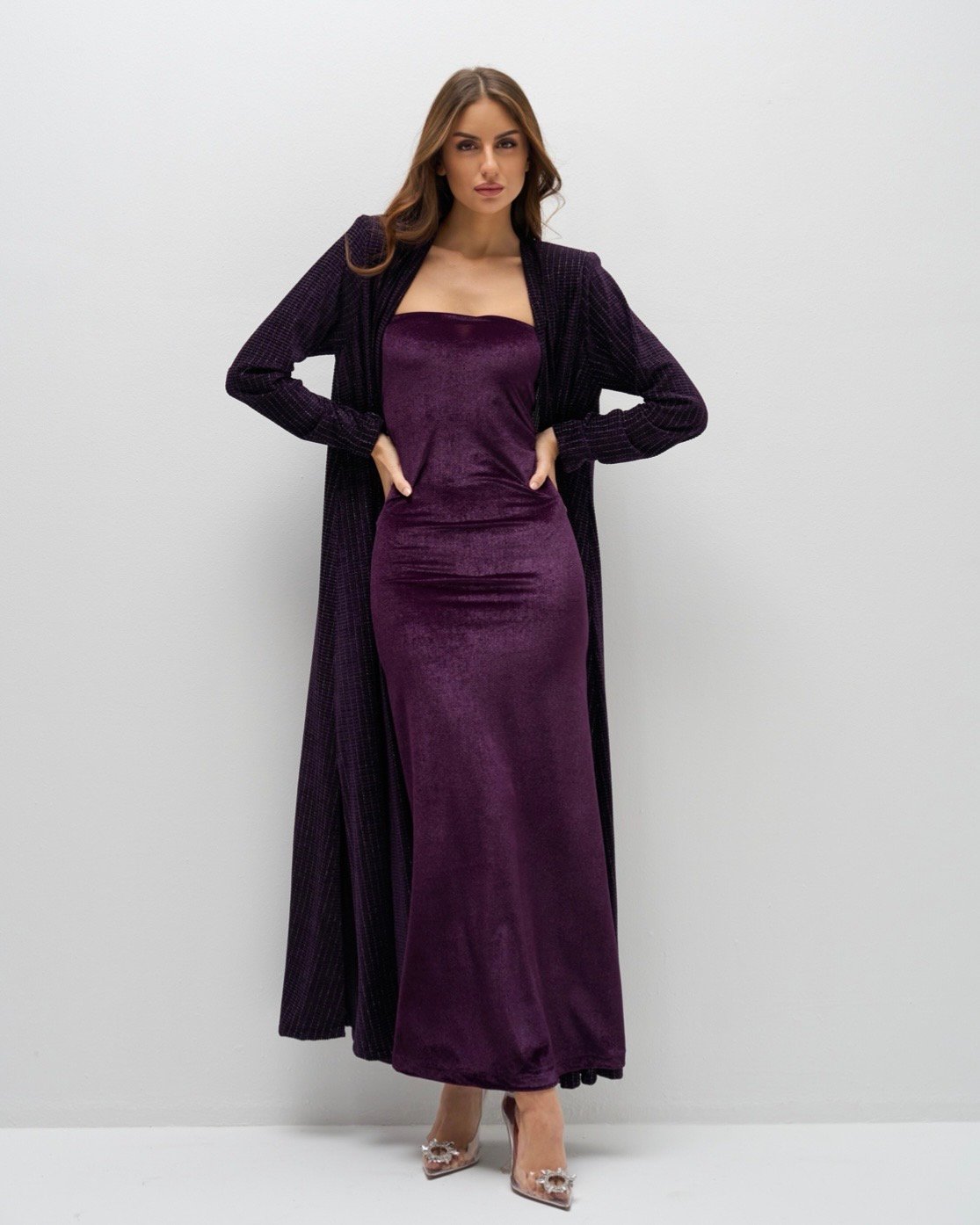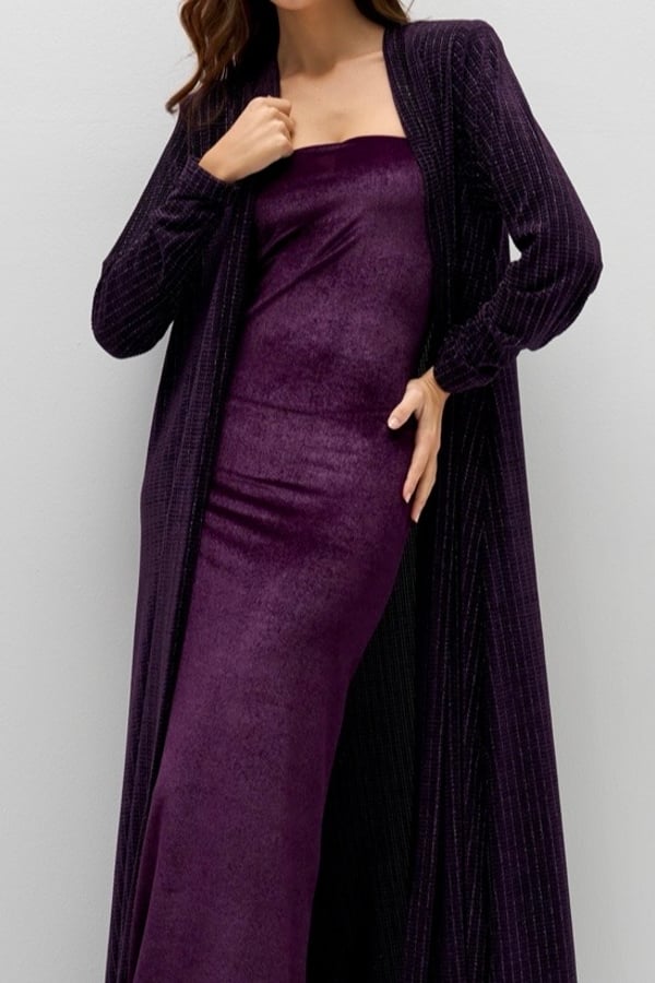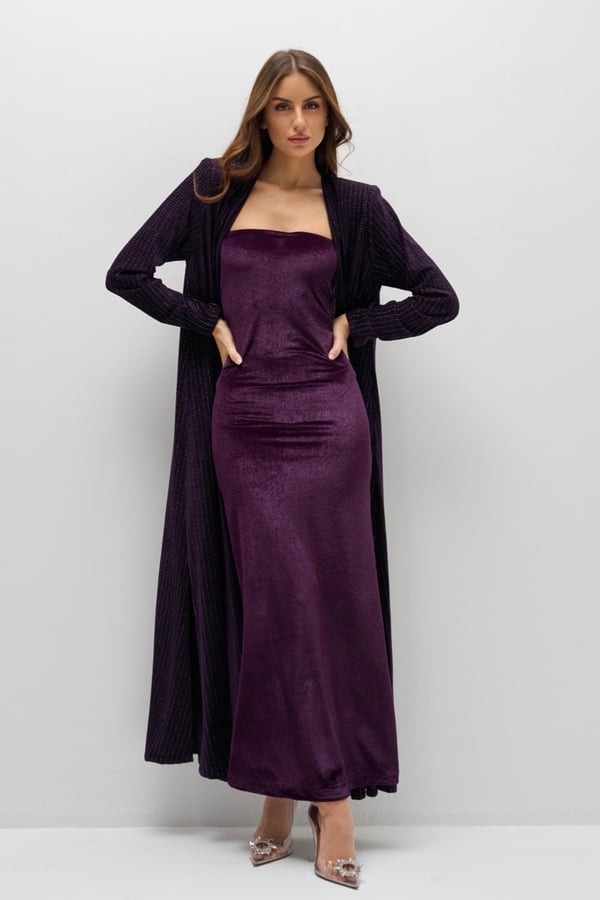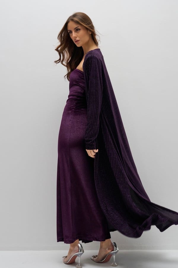 The set features a shimmering velvet sparkle cardigan with padded shoulders, layered over a stretchy velvet strapless dress. The purple shade is a unique and bold adding a striking element to the look.