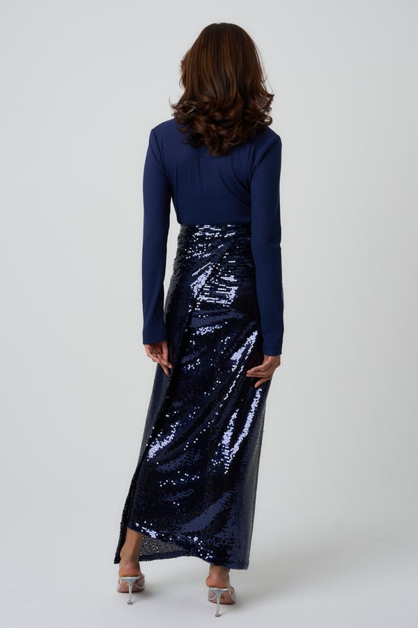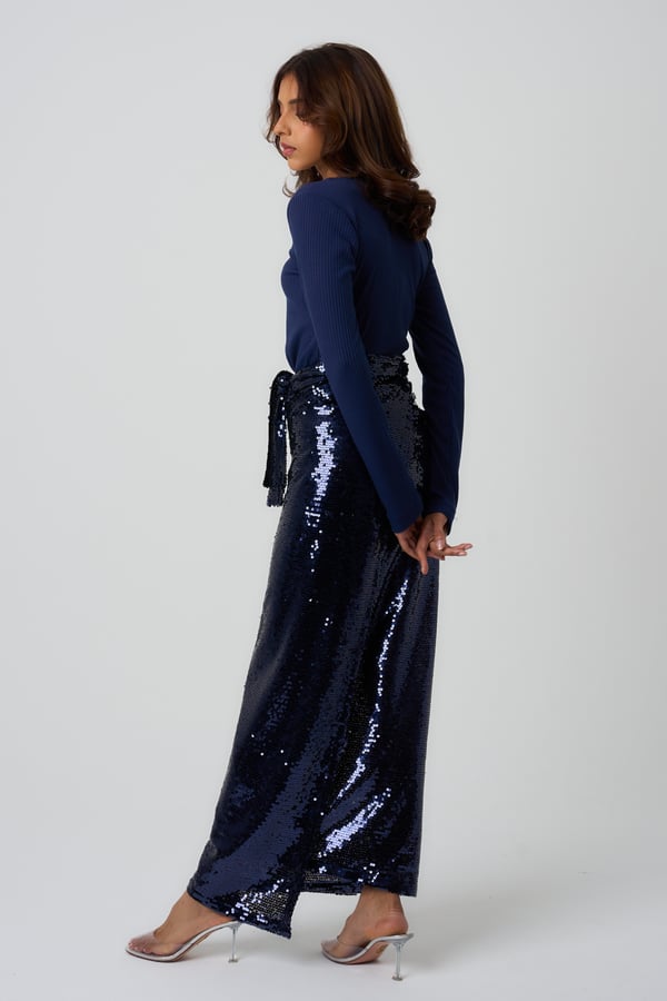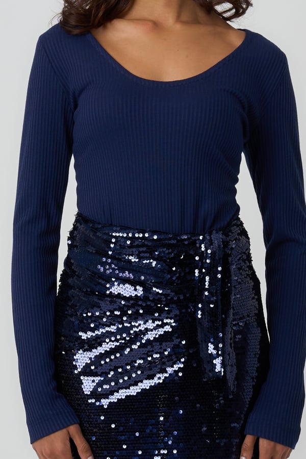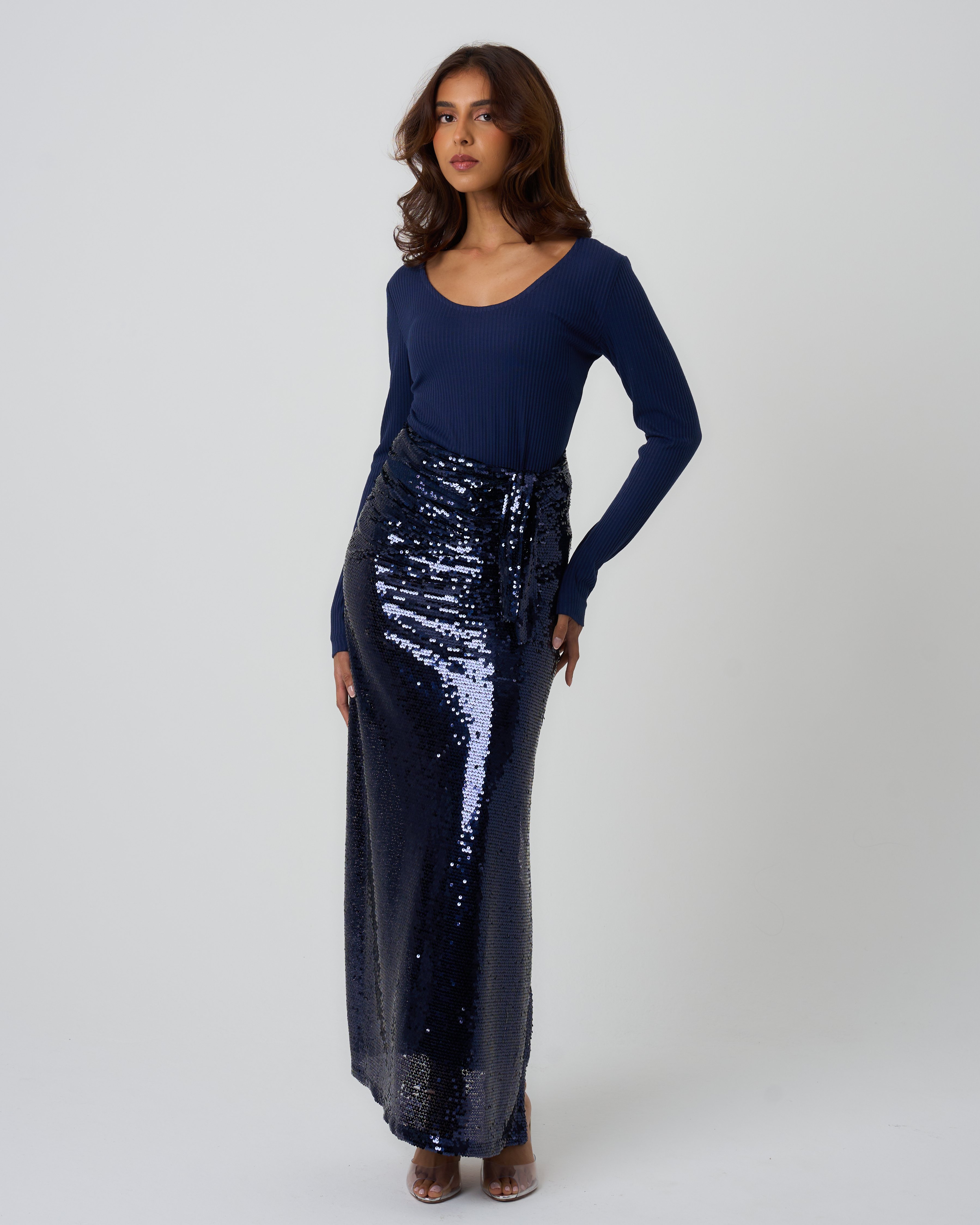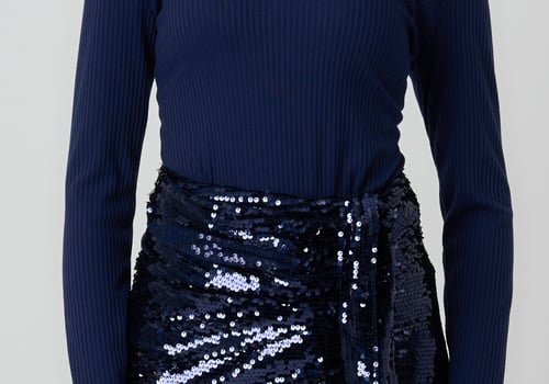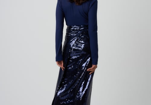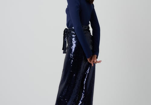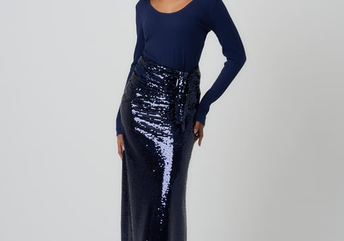 Style: Fitted jersey top with a sequin wrap skirt.
