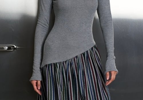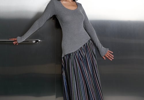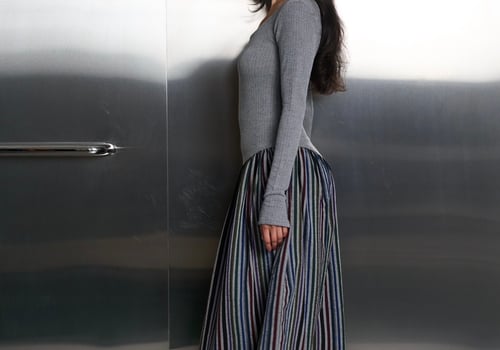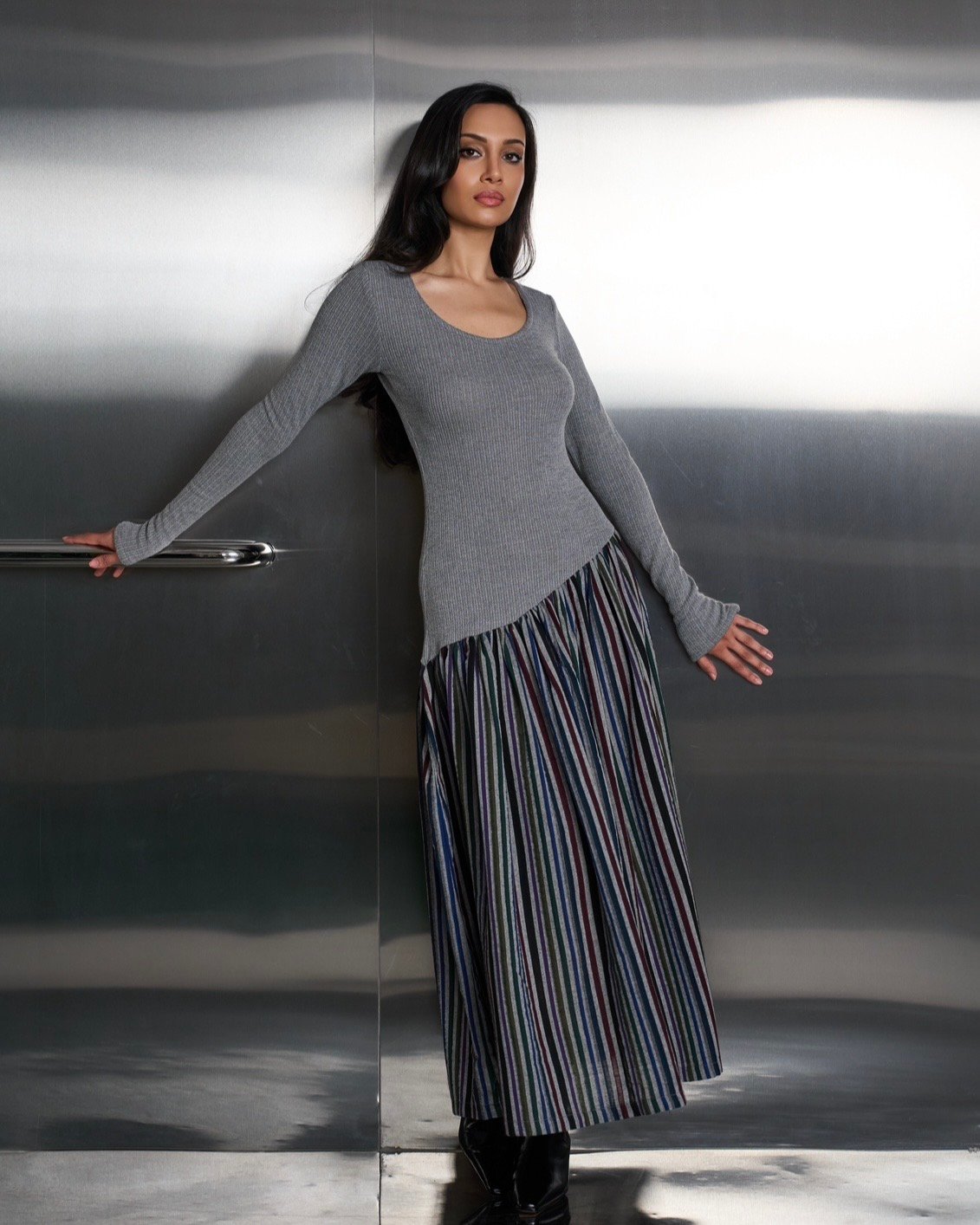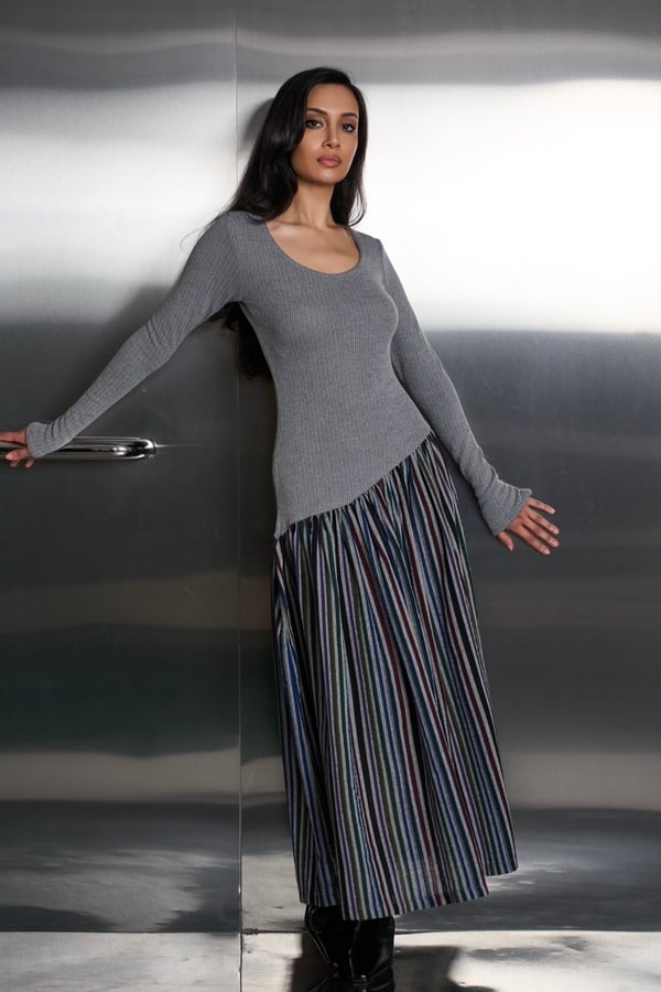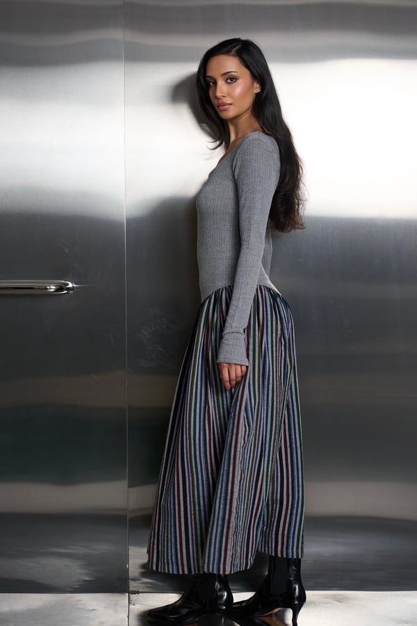 This dress has a fitted cozy knit top complemented by an attached flowing striped cotton linen bottom. It’s suitable for ramadhan and daily outings!