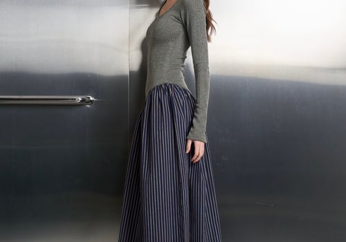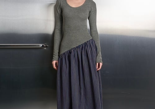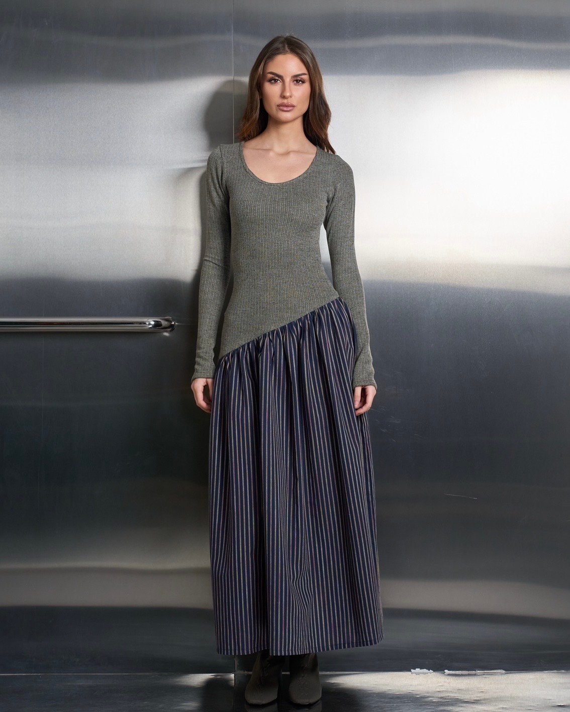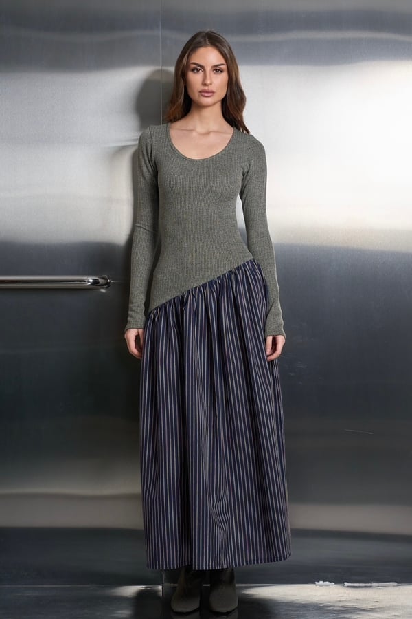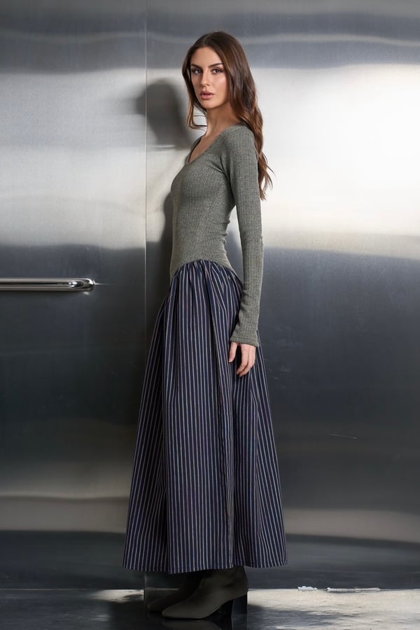 This dress has a fitted cozy knit top complemented by an attached flowing striped cotton linen bottom. It’s suitable for ramadhan and daily outings!