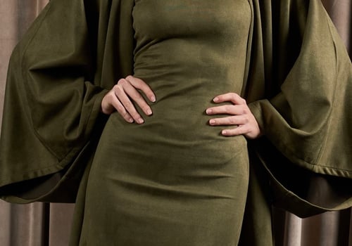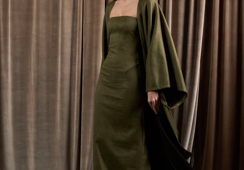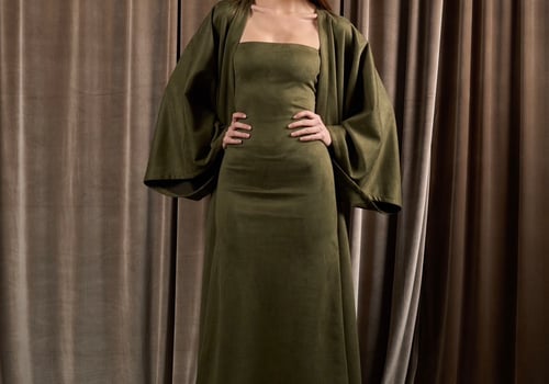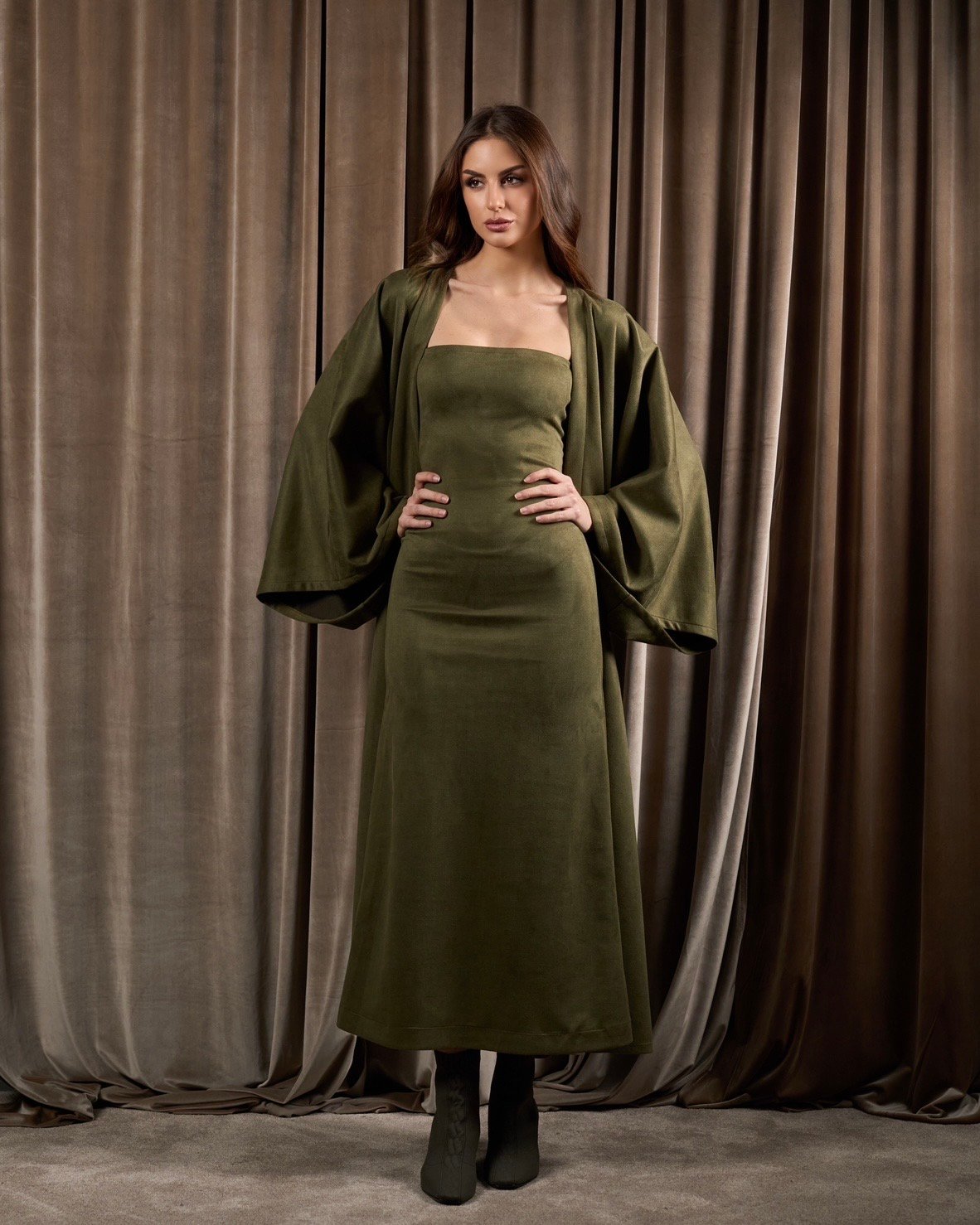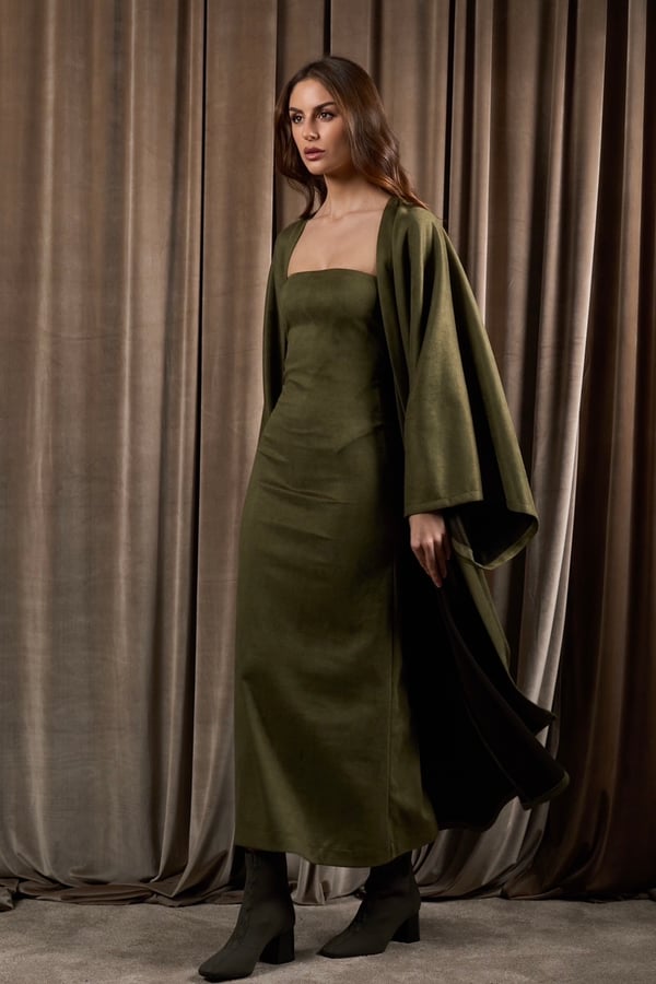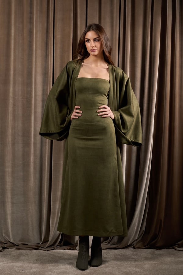 A suede set featuring an oversized bisht with a matching strapless dress. The bisht can be worn on its own or styled effortlessly with the dress for a complete look.