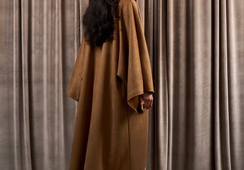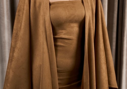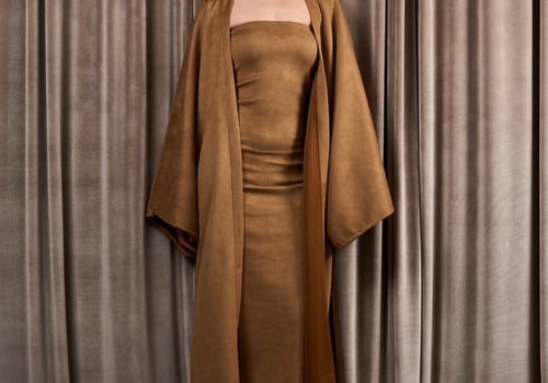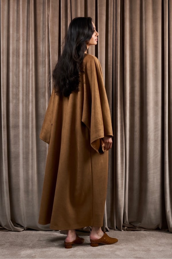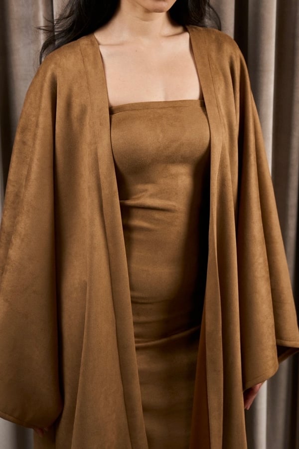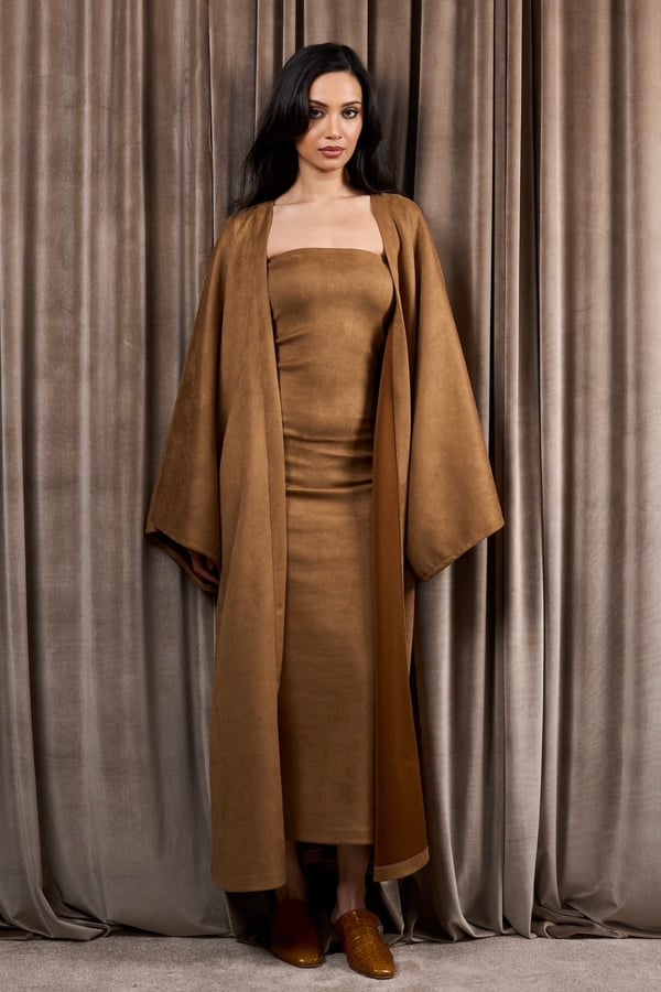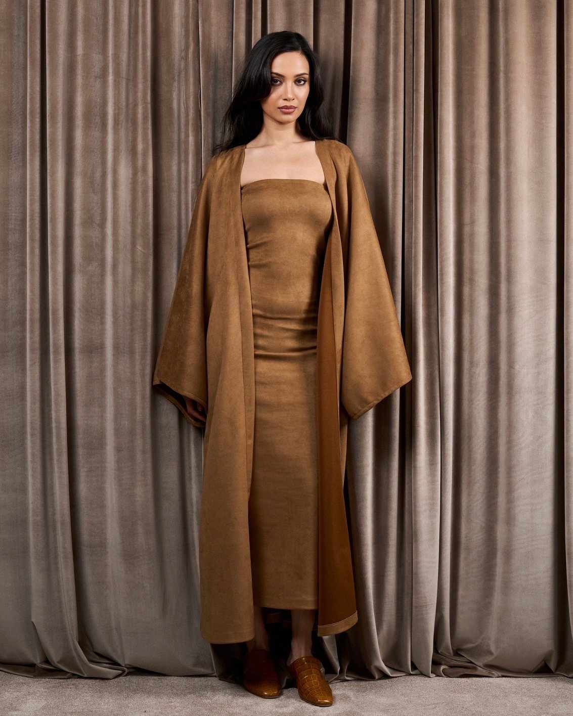 A suede set featuring an oversized bisht with a matching strapless dress. The bisht can be worn on its own or styled effortlessly with the dress for a complete look.
