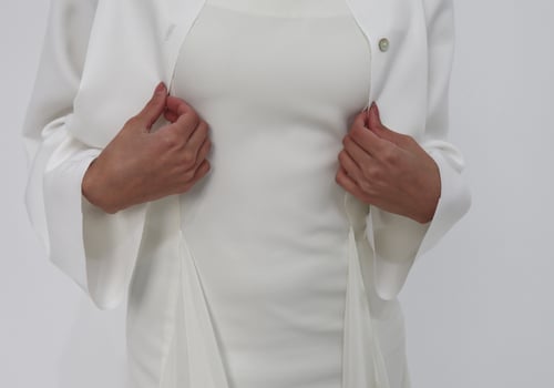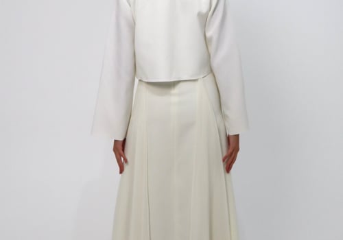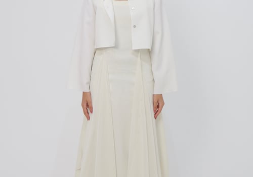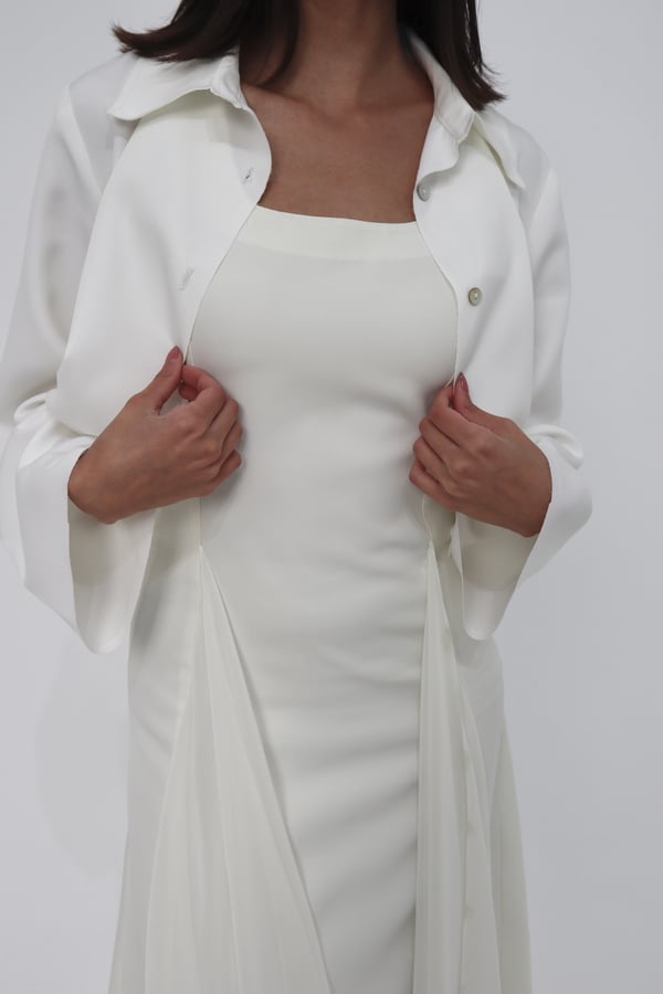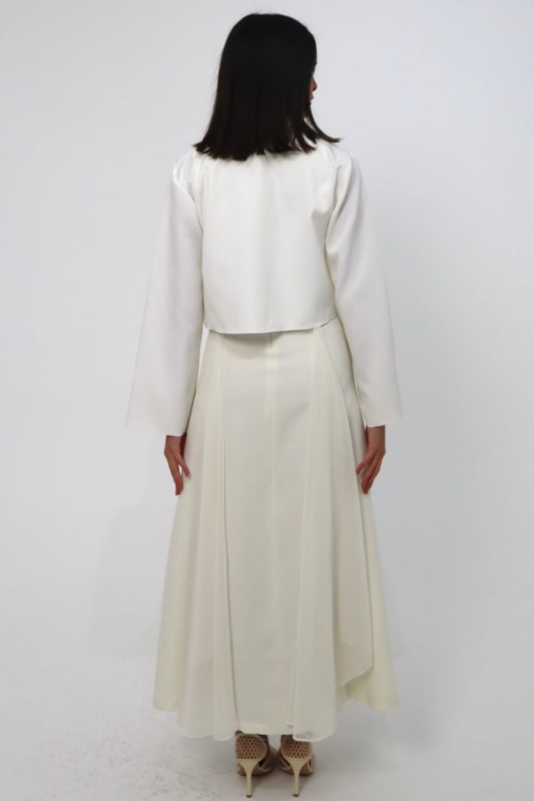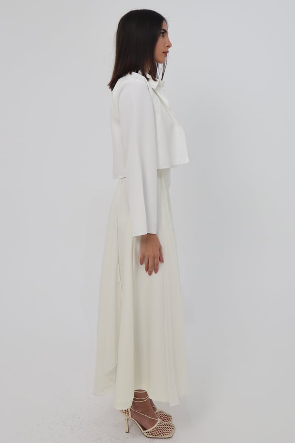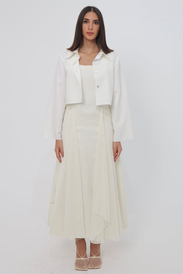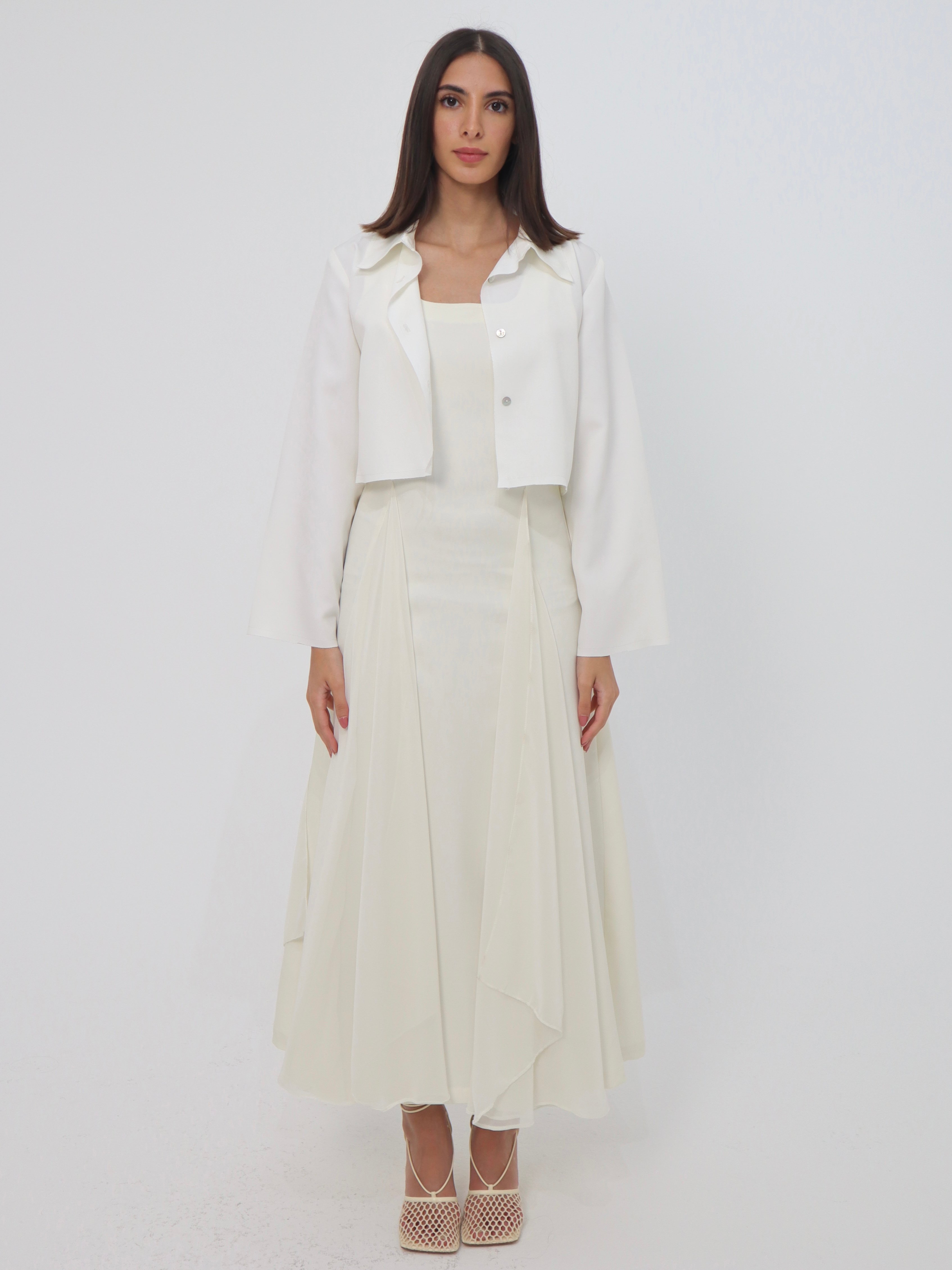 Two piece set: Cropped shirt jacket (you may choose long or short sleeves) with sleeveless waisted underdress.