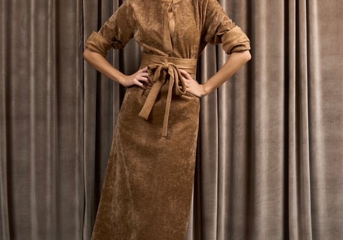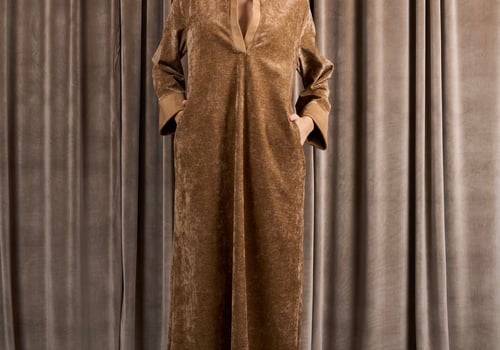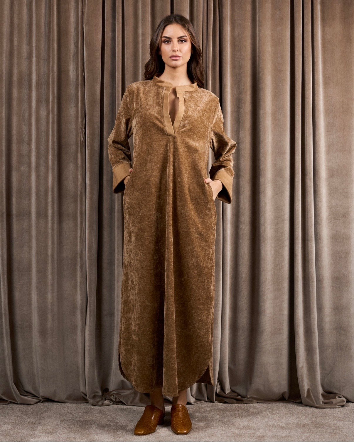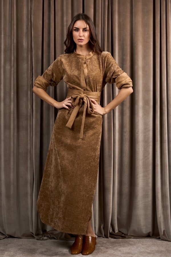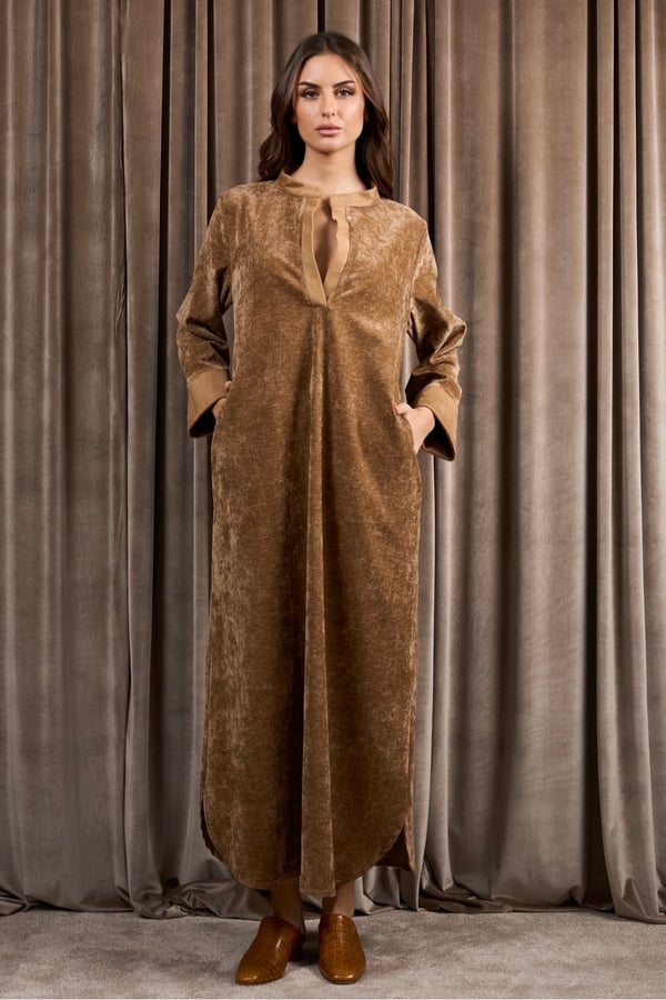 A velvet tunic dress featuring suede edges on the sleeves and neckline, along with a matching suede belt. You can wear it as a relaxed fit or with the belt for elevate the look.
