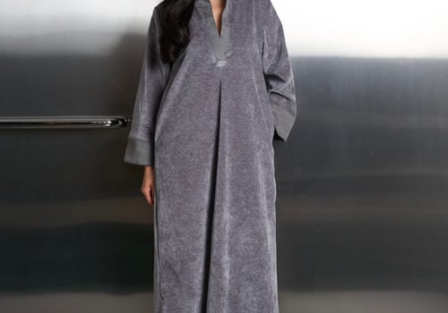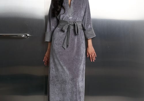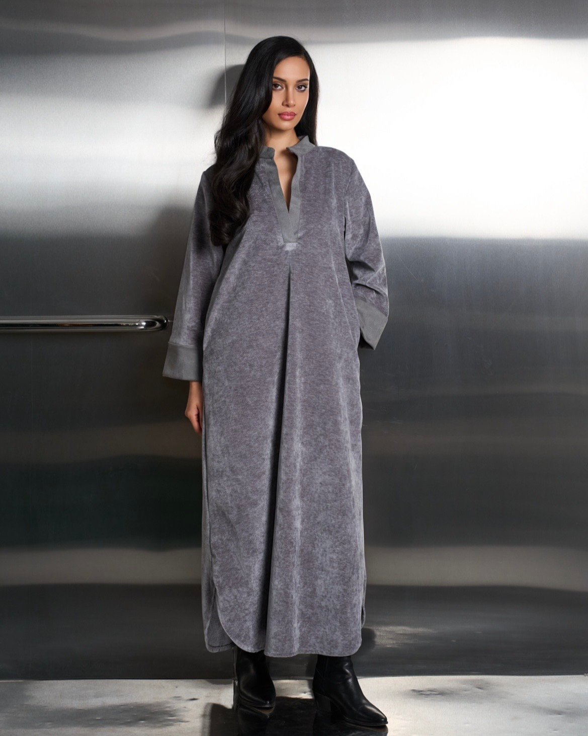 A velvet tunic dress featuring suede edges on the sleeves and neckline, along with a matching suede belt. You can wear it as a relaxed fit or with the belt for elevate the look.