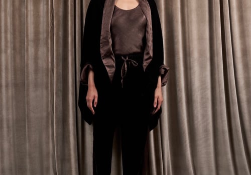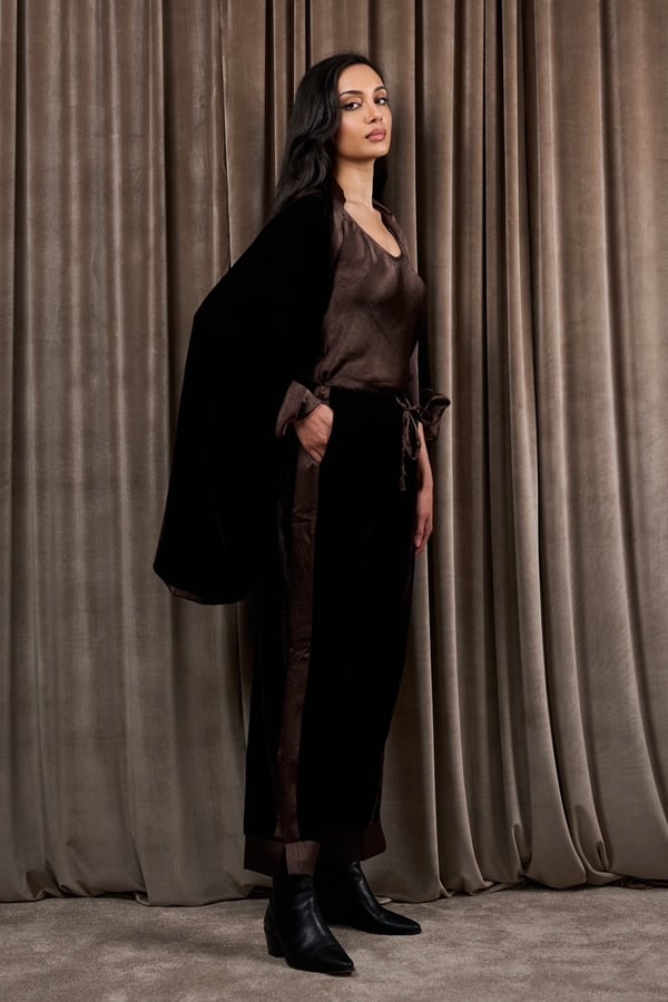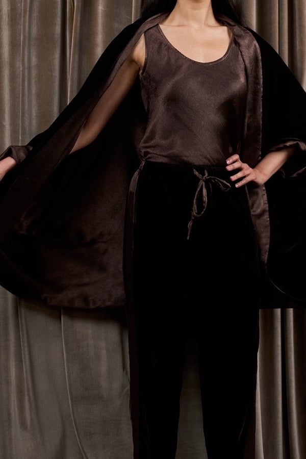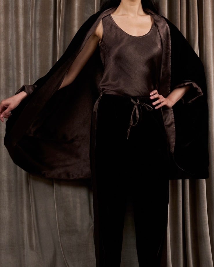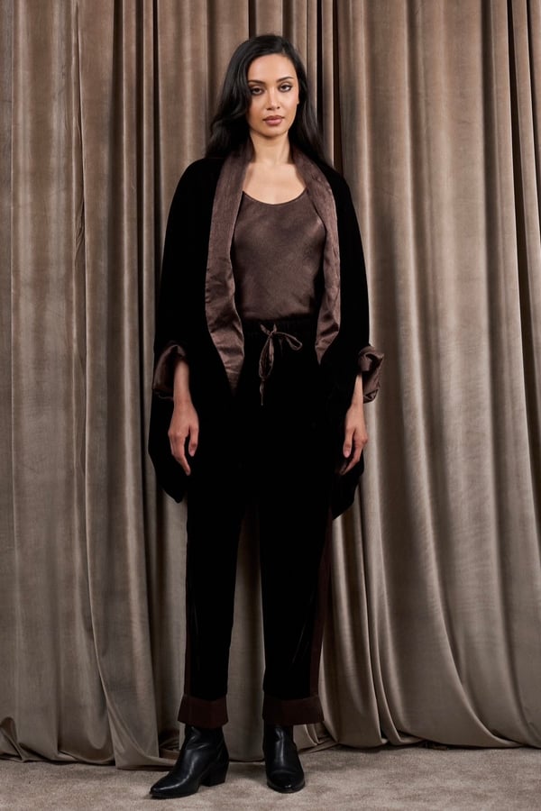 A 3-piece set featuring a velvet and silk reversible jacket with a silk cami top and velvet pants.