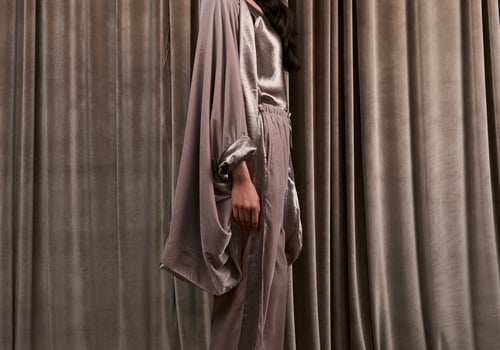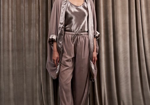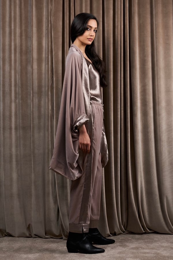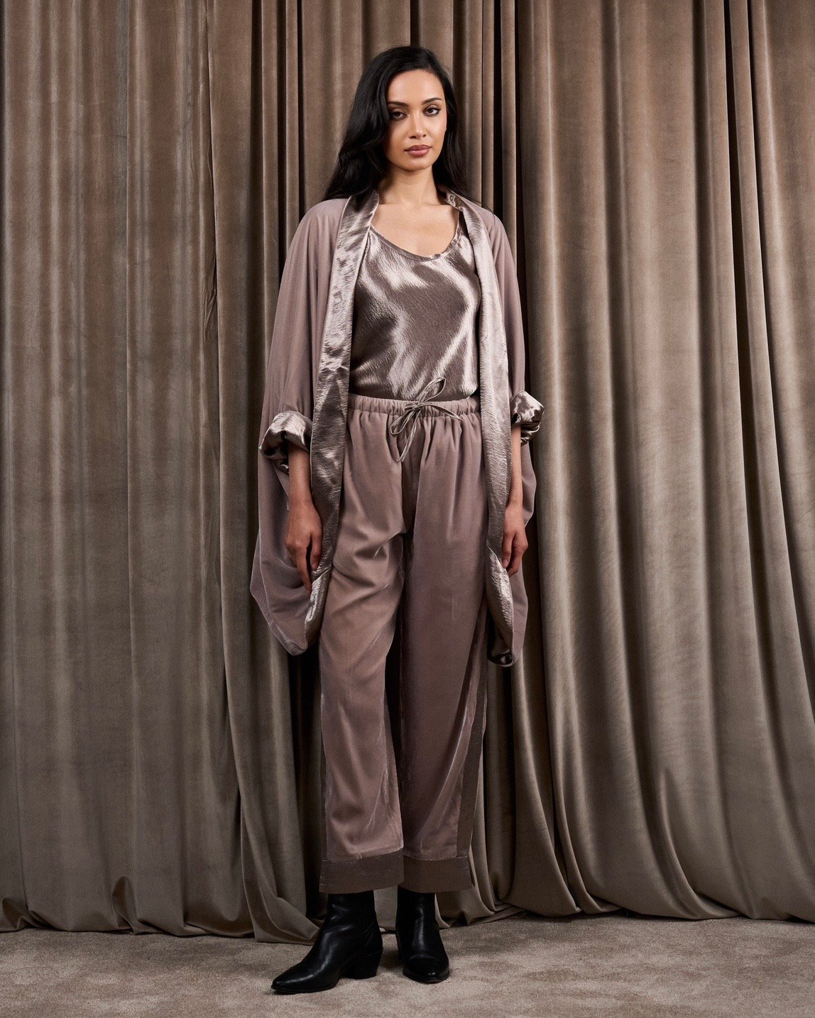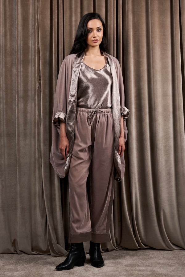 A 3-piece set featuring a velvet and silk reversible jacket with a silk cami top and velvet pants.