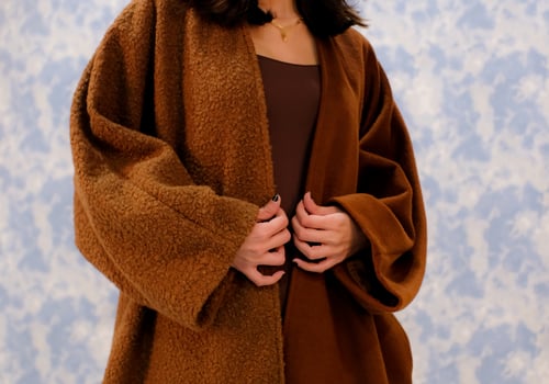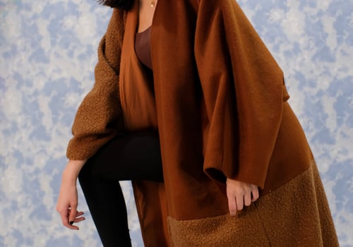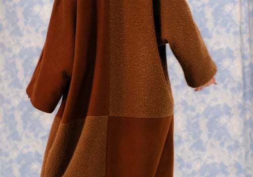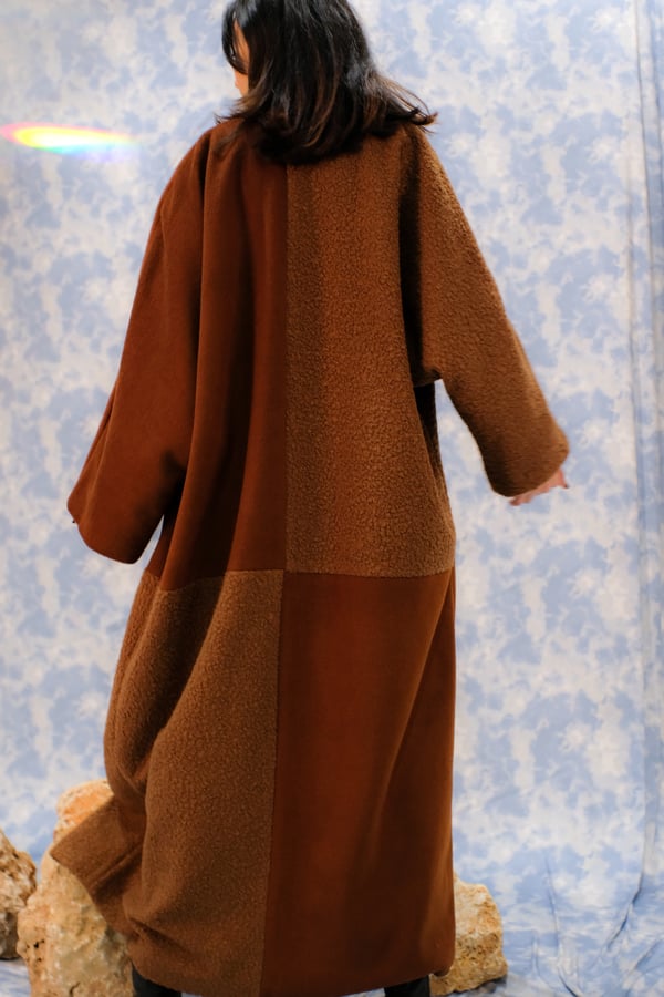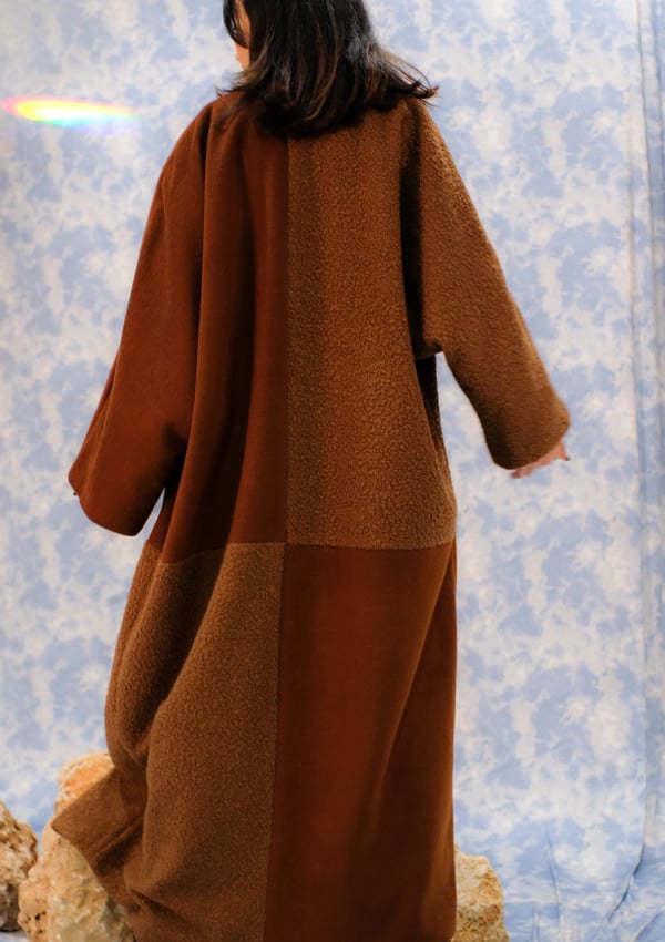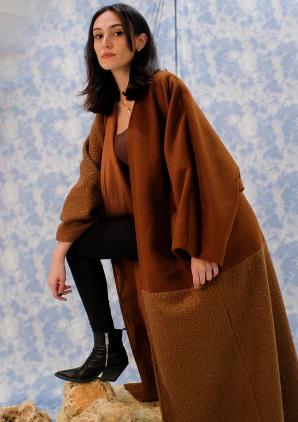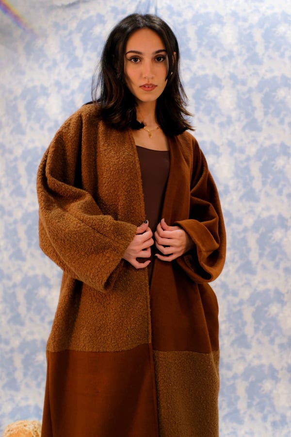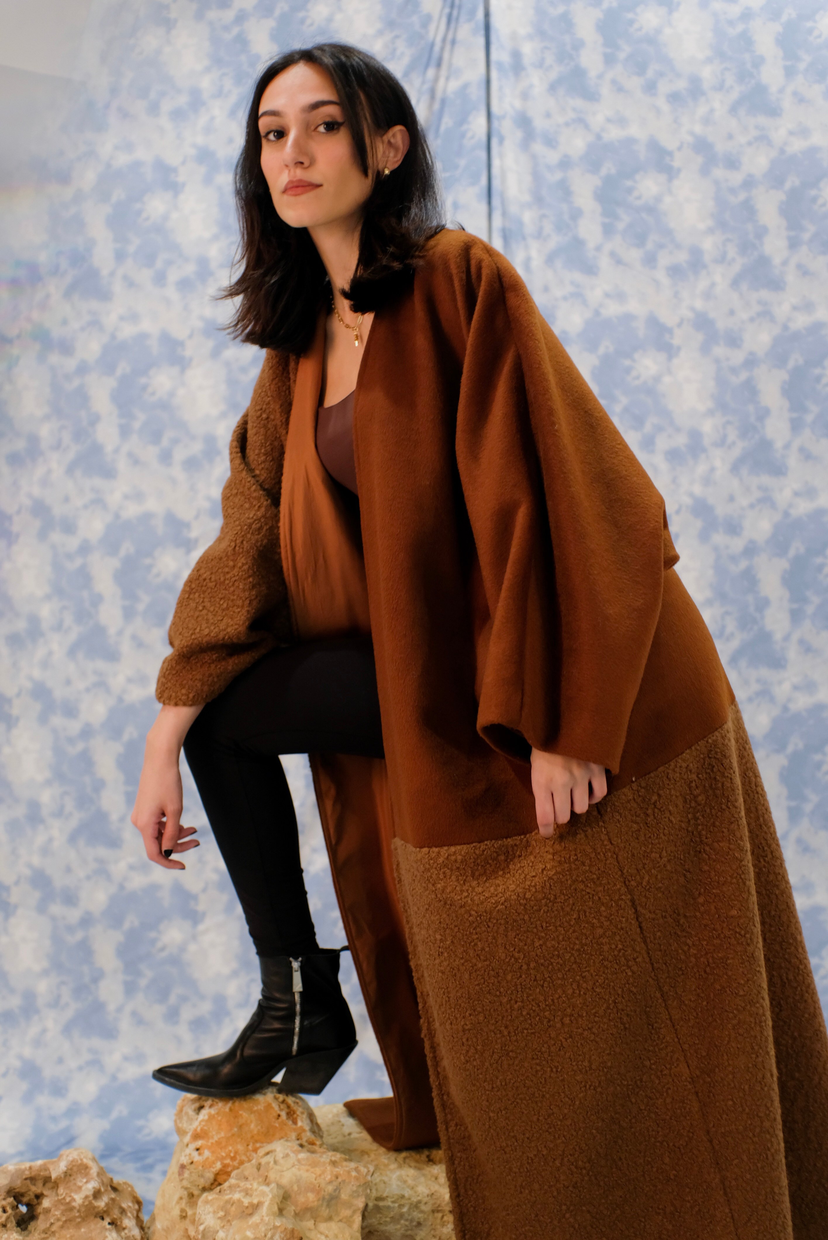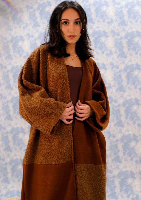 Winter bisht checkered in wool and shearling, both materials carry a similar shade of chestnut.